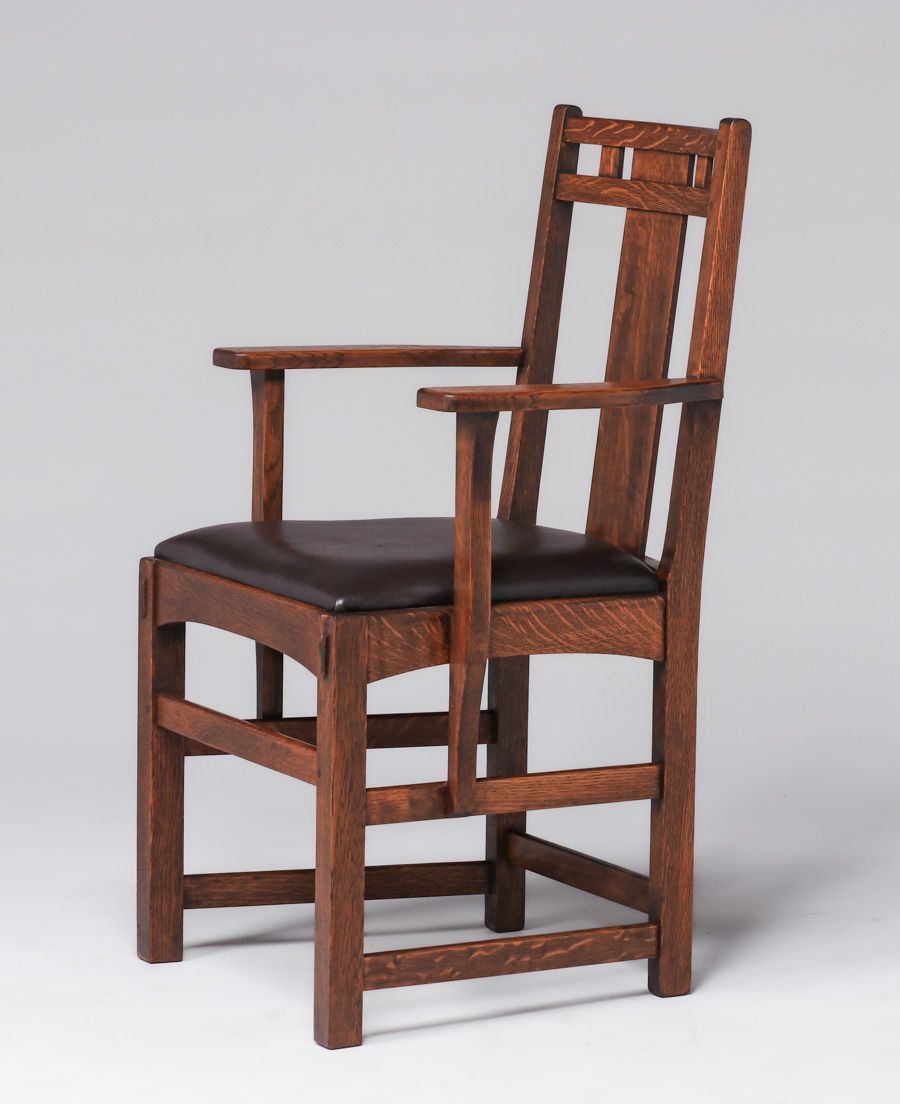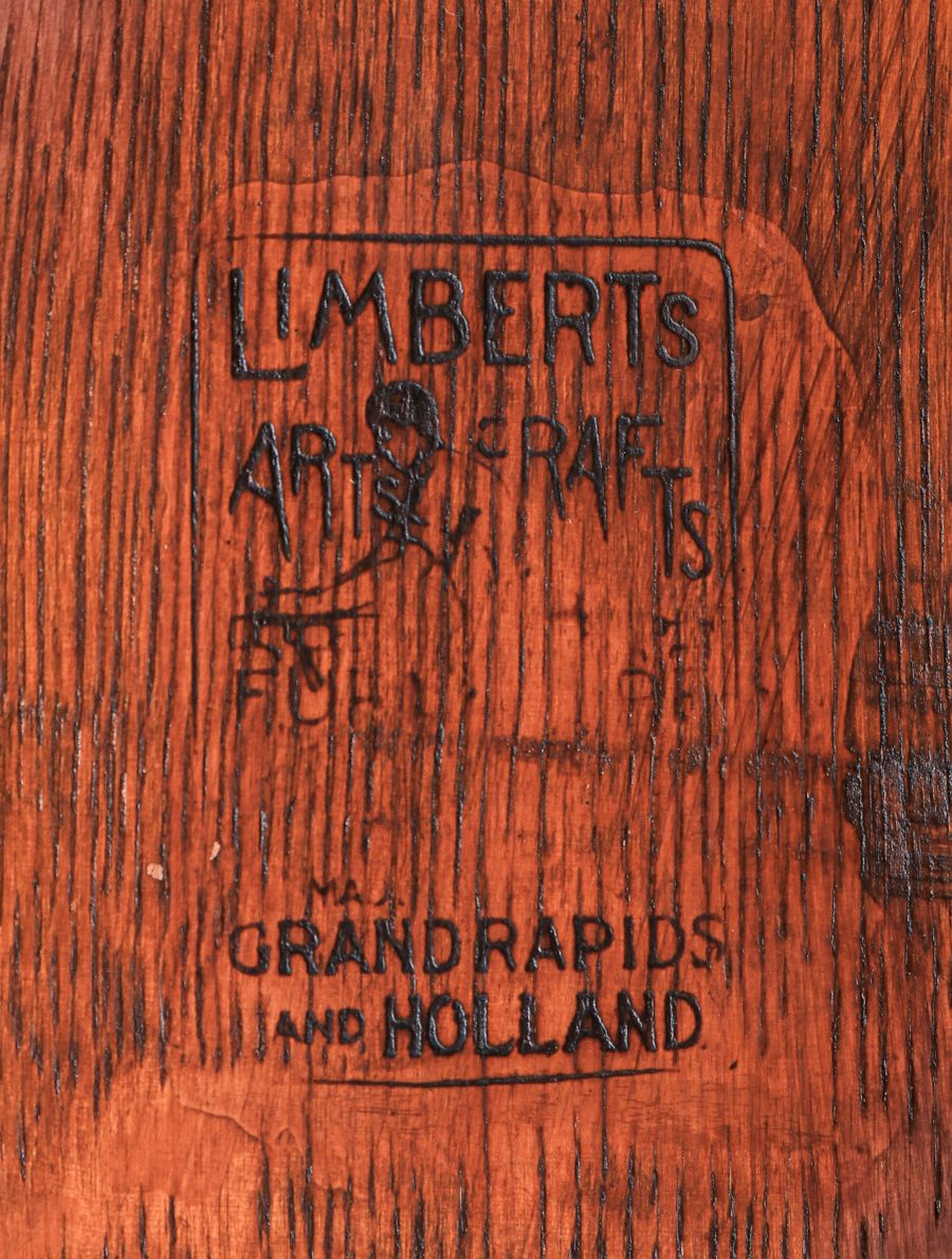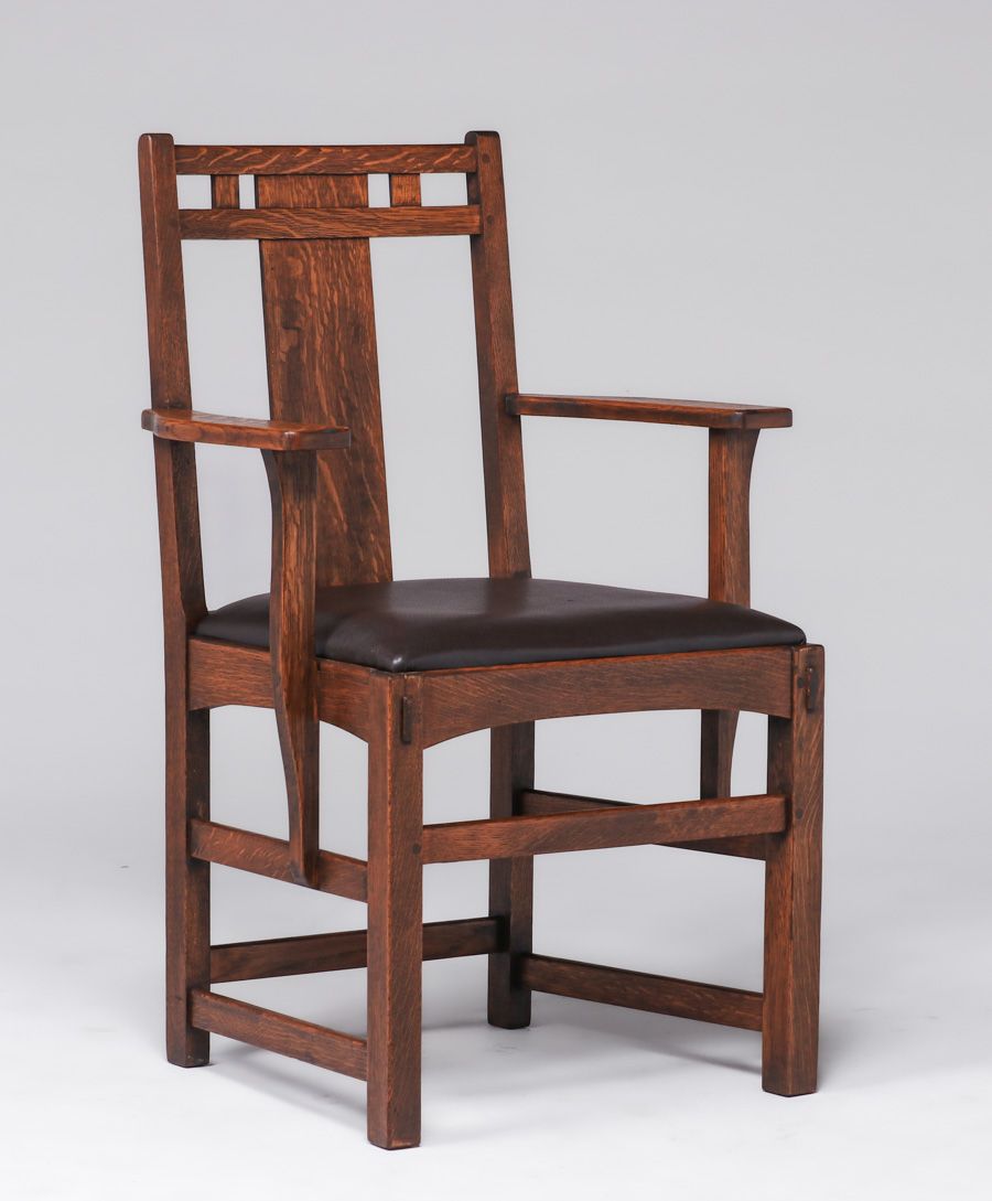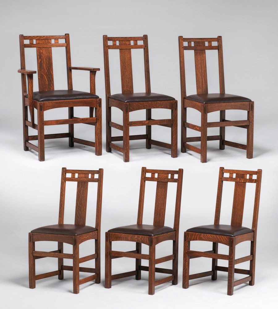 Limbert Set of 6 Dining Chairs c1910. Signed with branded mark. Very nicely refinished. Rock solid sturdy. Armchair 37"h x 24.5"w x 20"d. Side chairs 37"h x 17"d x 18"w SOLD