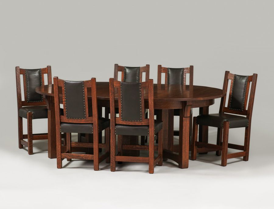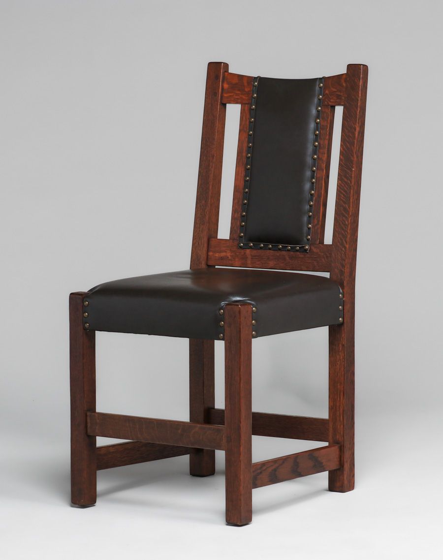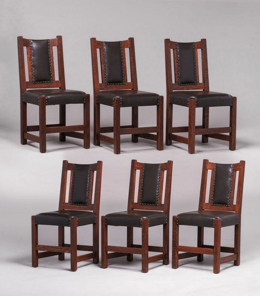 Limbert Set of 6 Leatherback Dining Chairs c1910. Signed. Very nicely refinished. Rock solid sturdy. 36.75″h x 18.5″w x 21.5″d $6500 set of 6