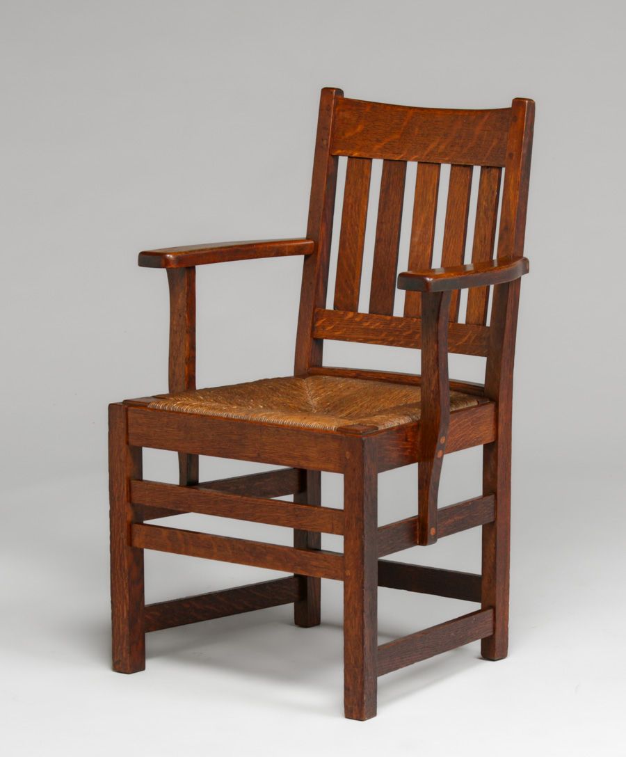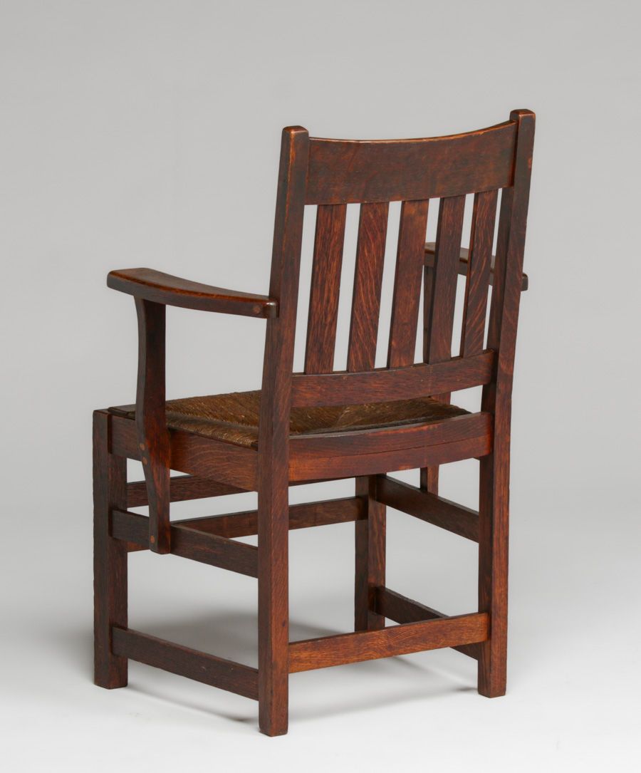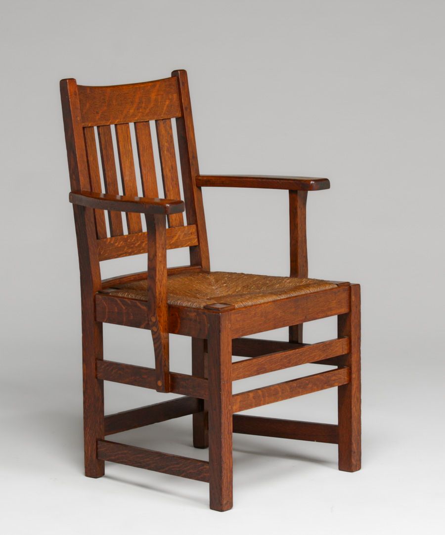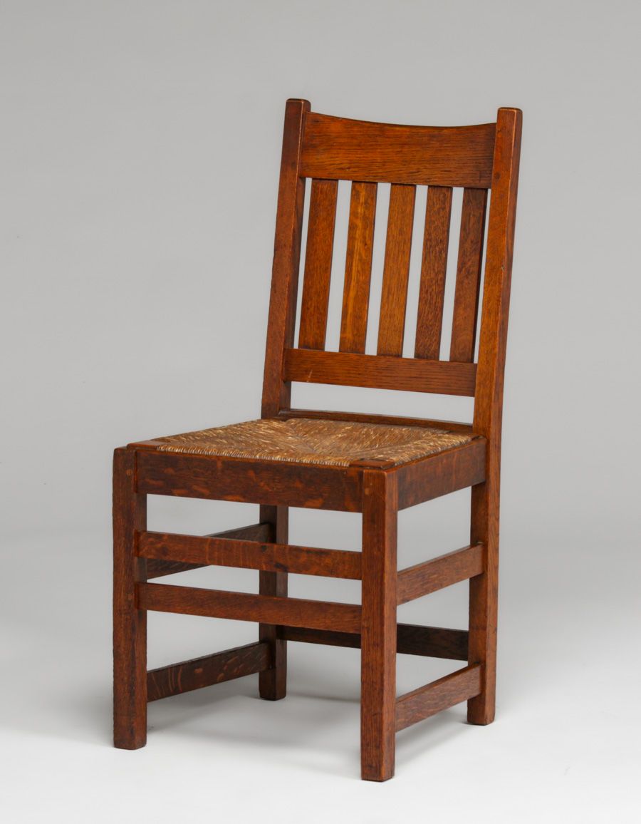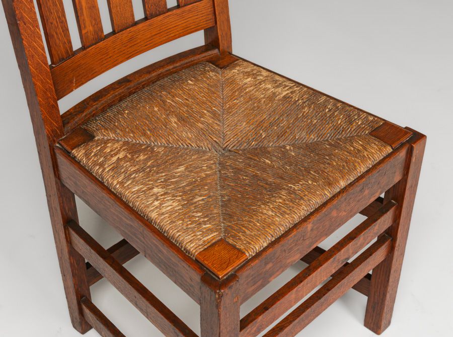 Limbert Set of 6 Oak Dining Chairs c1910. Signed with branded mark. Excellent original finish and original rush seats. Rock solid sturdy. Armchair36"h x 24"w x 20"d. Side Chairs 36.25"h x 17.75"w x 17"d