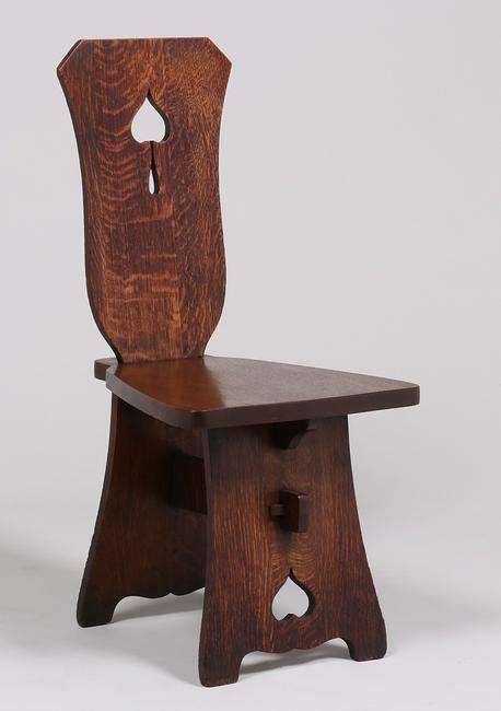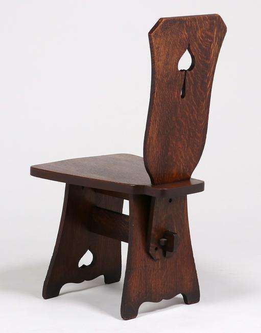 Limbert Spade Cutout Hall Chair c1910. Signed with branded mark. Surface of seat very nicely refinished to match original finish. 38.5"h x 17.5"w x 21"d SOLD