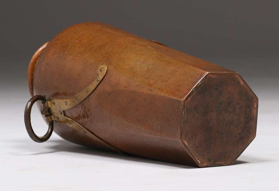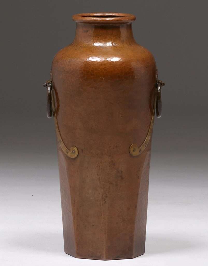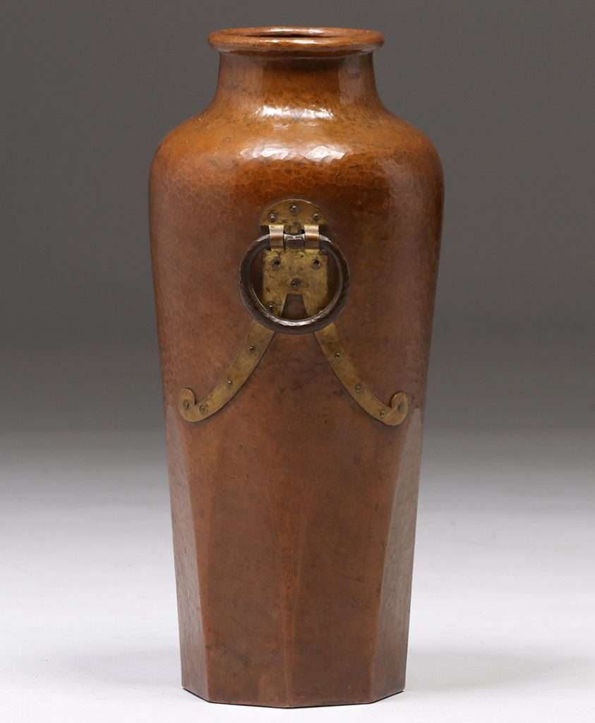 Rare Limbert Hammered Copper & Brass Two-Handled Vase Eight-Sided Base c1910. Unsigned. These specific handles are shown on Limbert lamp bases in both the Terry Seger Collection and Don Marek Grand Rapids Metalwork book. Excellent original patina. 13.5"h x 5.5"d SOLD