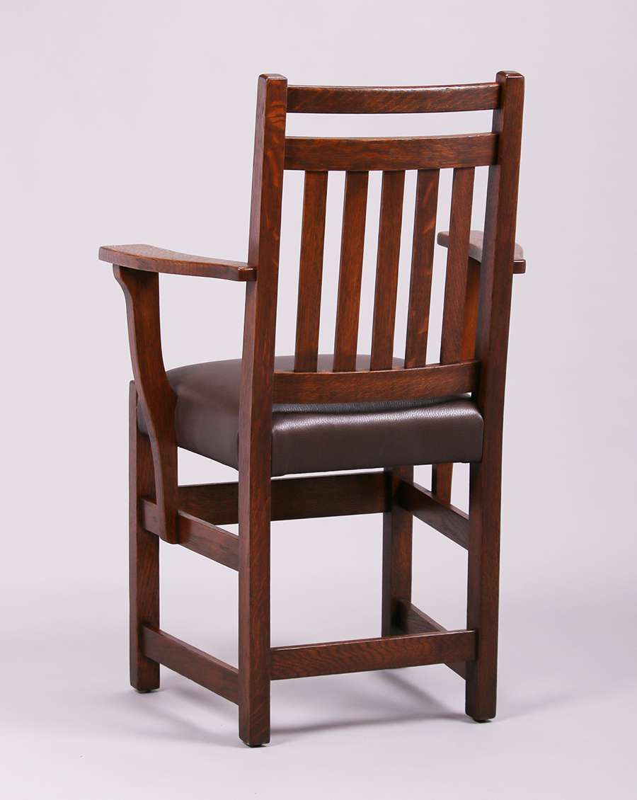 Set of 4 Limbert dining chairs with five vertical slats in back. Signed with branded mark. Refinished. Armchair measures 36.5"h x 23.5"w x 20"d. Side chairs each measure 36.5"h x 17.5"w x 17"d SOLD