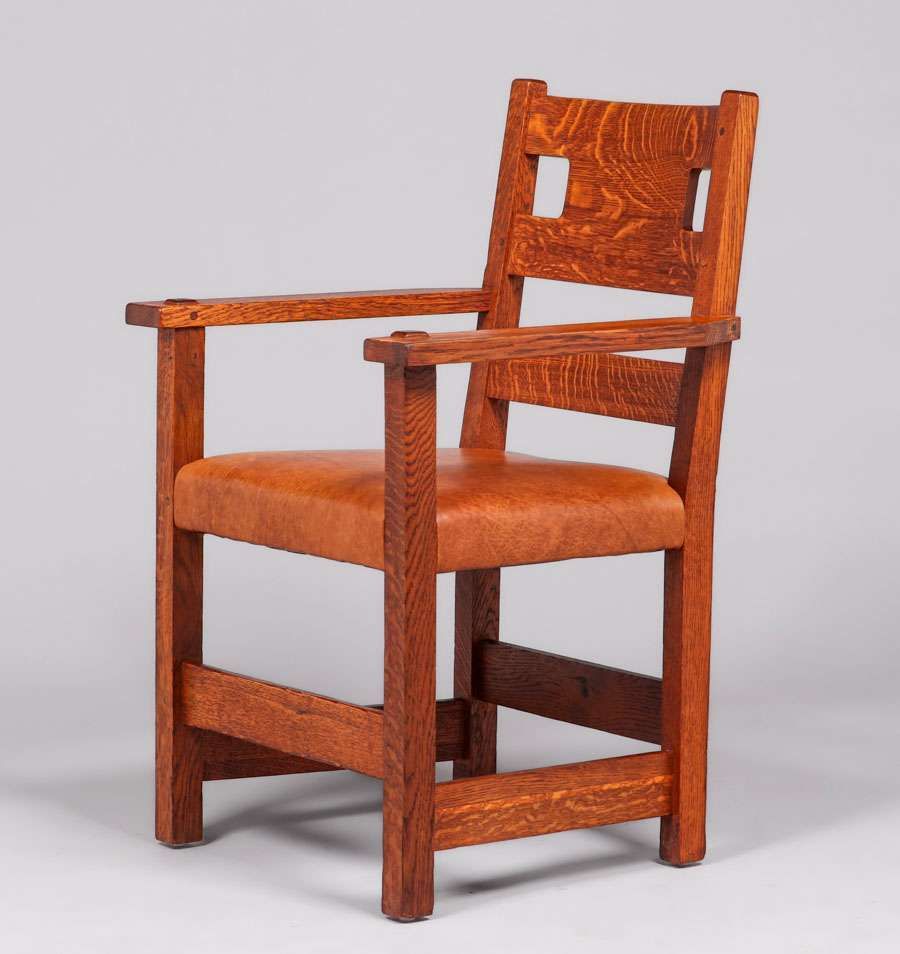 Set of 6 Limbert Cutout Dining Chairs c1910. Very rare to find a complete set of this cutout form. Signed with branded mark. Overcoated original finish. Rock solid sturdy. Armchair 36"h x 24.25"w x 20"d. Side chairs 34.75"h x 17.75"w x 16"d SOLD