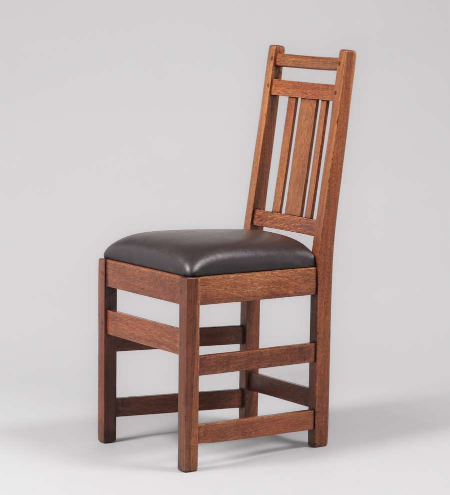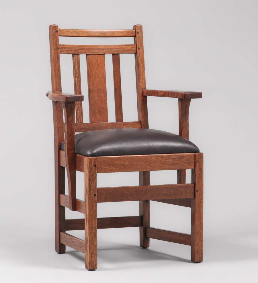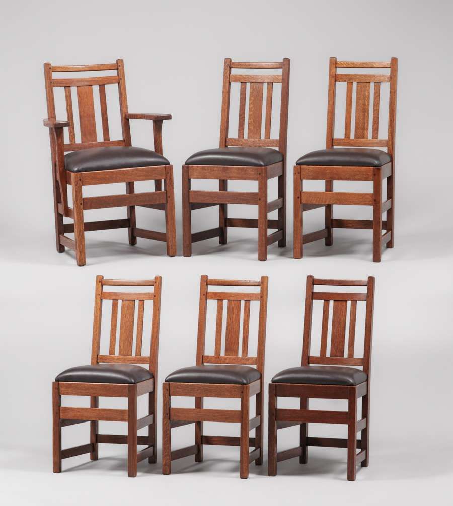 Set of 6 Limbert Dining Chairs c1910. Signed. Excellent original finish. Rock solid sturdy. Armchair 36.25"h x 23.5"w x 19"d. Side chairs 36.25"h x 16.5"w x 16" SOLD