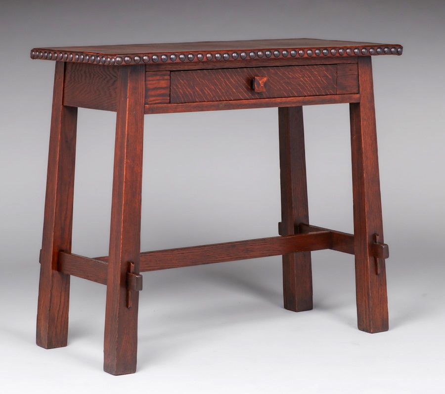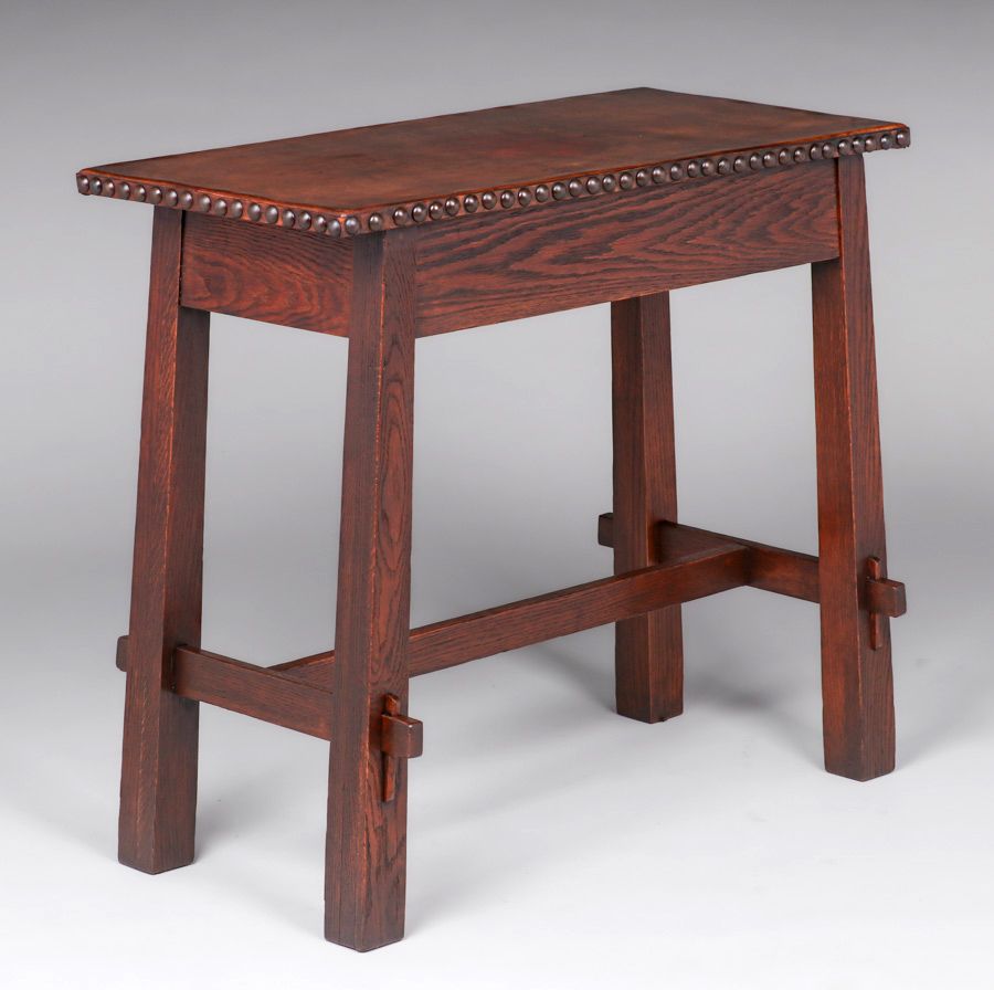 Early L&JG Stickley Onondaga One-Drawer Reverse-Tapered Leather-Top Side Table c1902. Unsigned. New leather. Excellent original finish. 34.5"w x 30"h x 16.75"d SOLD