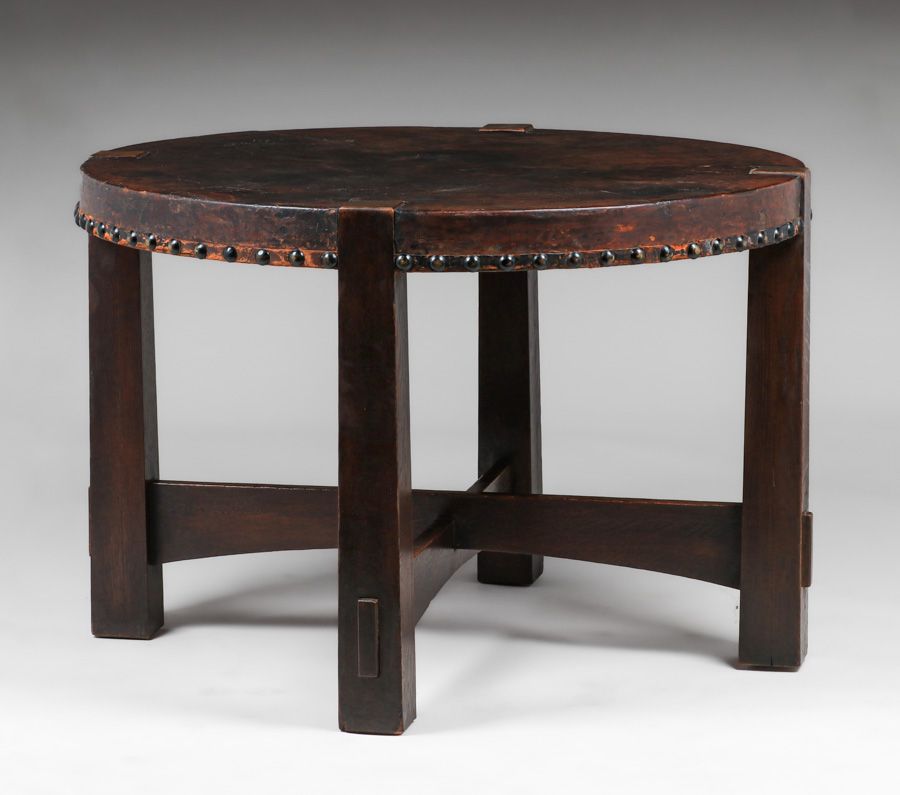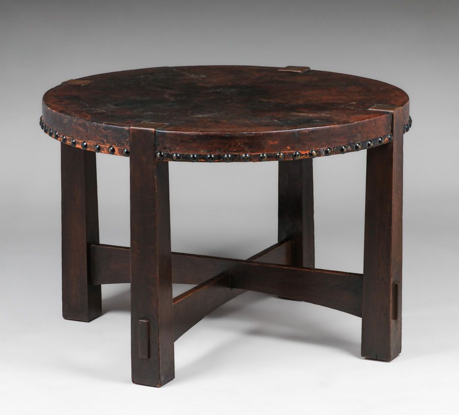 Early L&JG Stickley Onondaga Reverse-Tapered Leather-Top Table c1902. In 1901 Gustav Stickley first designed this form. Leopold and John George had been working for their older brother Gustav at United Crafts. By 1902, they had formed their own company, The Onondaga Shops (with Gustav's blessing). They copied a number of Gustav Stickley's successful designs, changing them just slightly to differentiate themselves. Unsigned. Excellent original finish and original leather. 43"d x 29.5"h SOLD