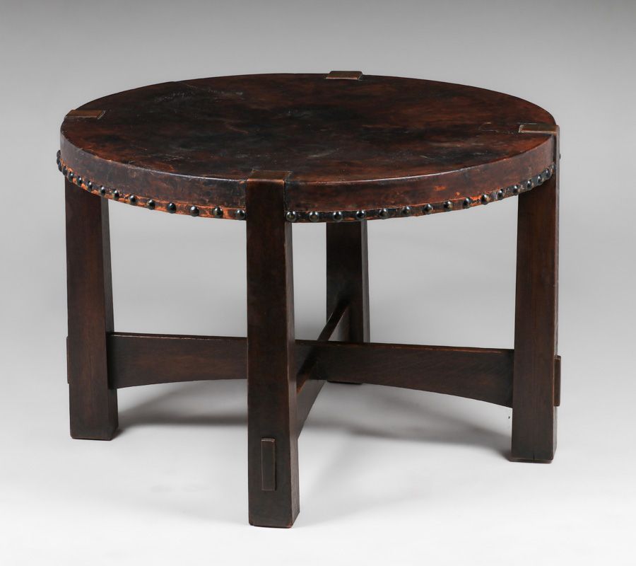 - Early L&JG Stickley Onondaga Reverse-Tapered Leather-Top Table c1902
