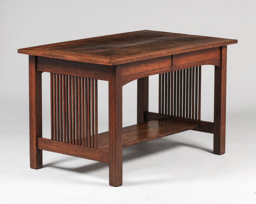 - Early L&JG Stickley Onondaga Spindled Leather-Top Two-Drawer Library Table c1902-1904