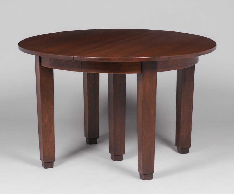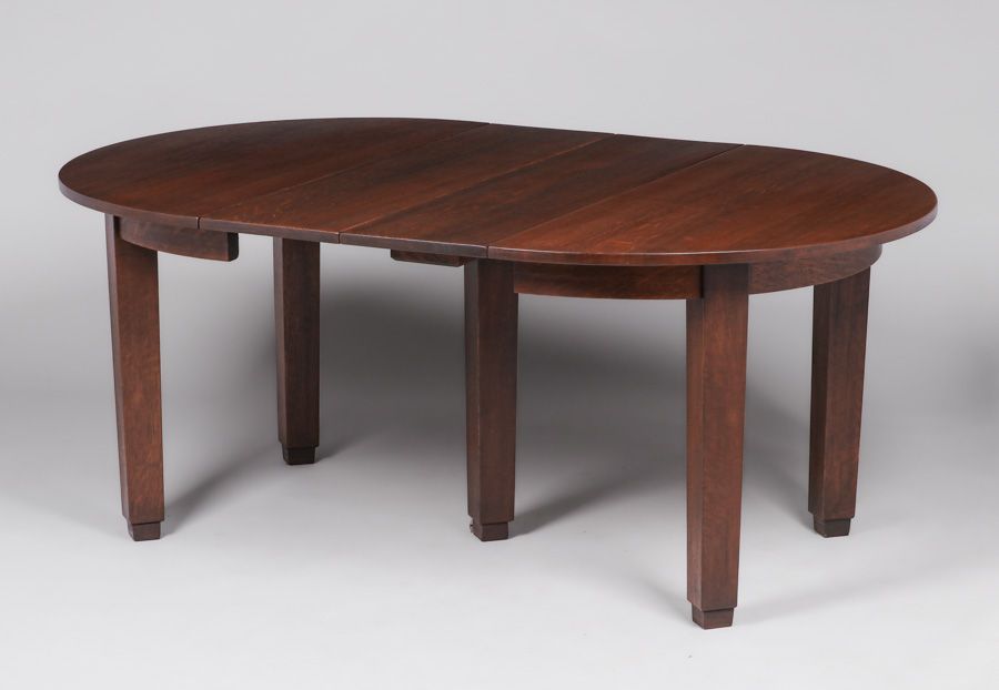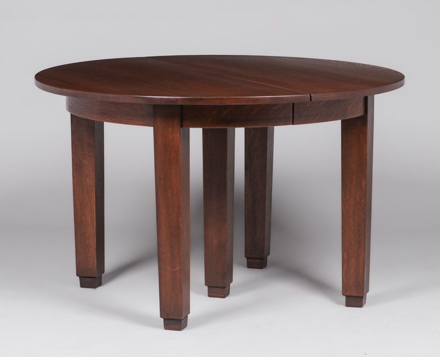 L&JG Stickley 48"d Five-Leg Dining Table c1910. Includes four 12"w original leaves. Unsigned. Very nicely refinished. 48"w x 29.75"h (extends to 96"w x 48") $5500