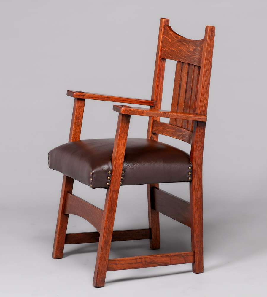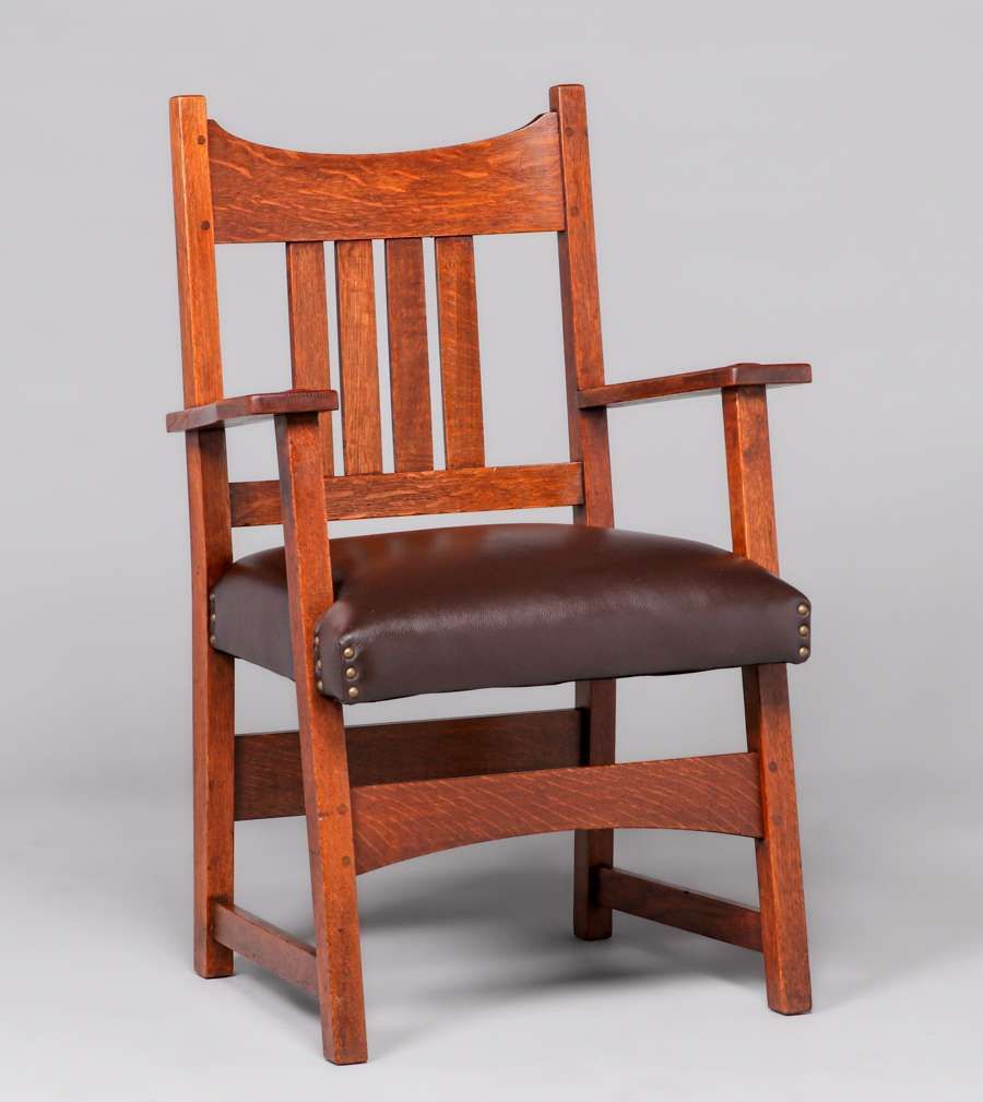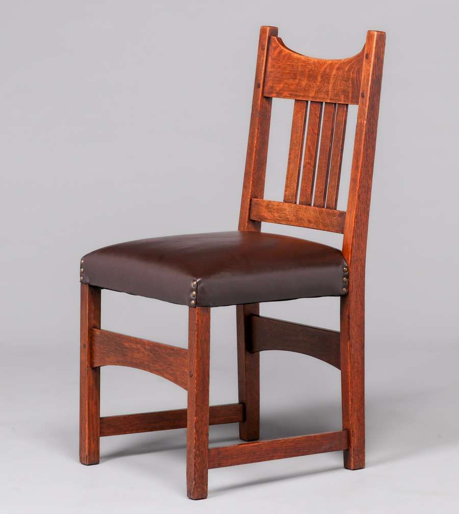 L&JG Stickley 54"d Dining Table & 6 Chairs c1910. Four original 11.25"w leaves in original crate. Signed. Excellent original finish. Chairs rock solid sturdy. Table 54"d x 30" (99" x 54" with leaves). Armchair 38”h x 26”w x 19”d. Side Chairs 36”h x 18”w x 17”d SOLD