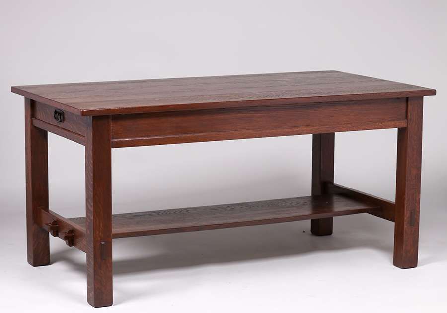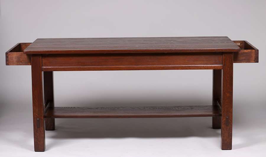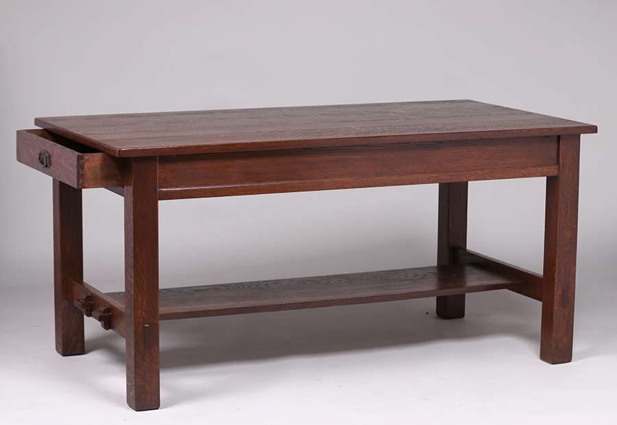 Rare variation L&JG Stickley 60" Library Table with Drawer on each end c1907-1912. Signed. Very nicely refinished. Rock solid sturdy. 60" x 31.5"w x 29.5"d SOLD