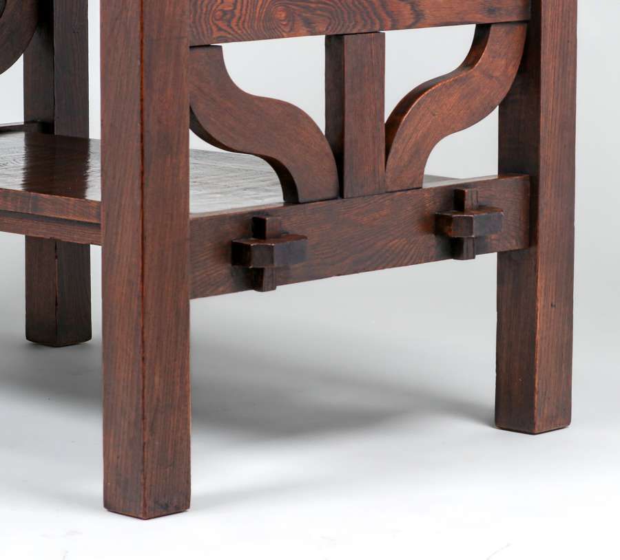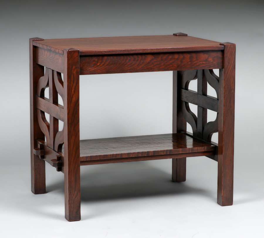 L&JG Stickley Onondaga Curved Slat Library Table c1902-1904. L&JG Stickley experimented with a line of these curved slat forms and they a quite rare. Unsigned. Very nicely refinished. 32″w x 24″d x 30″h $4500