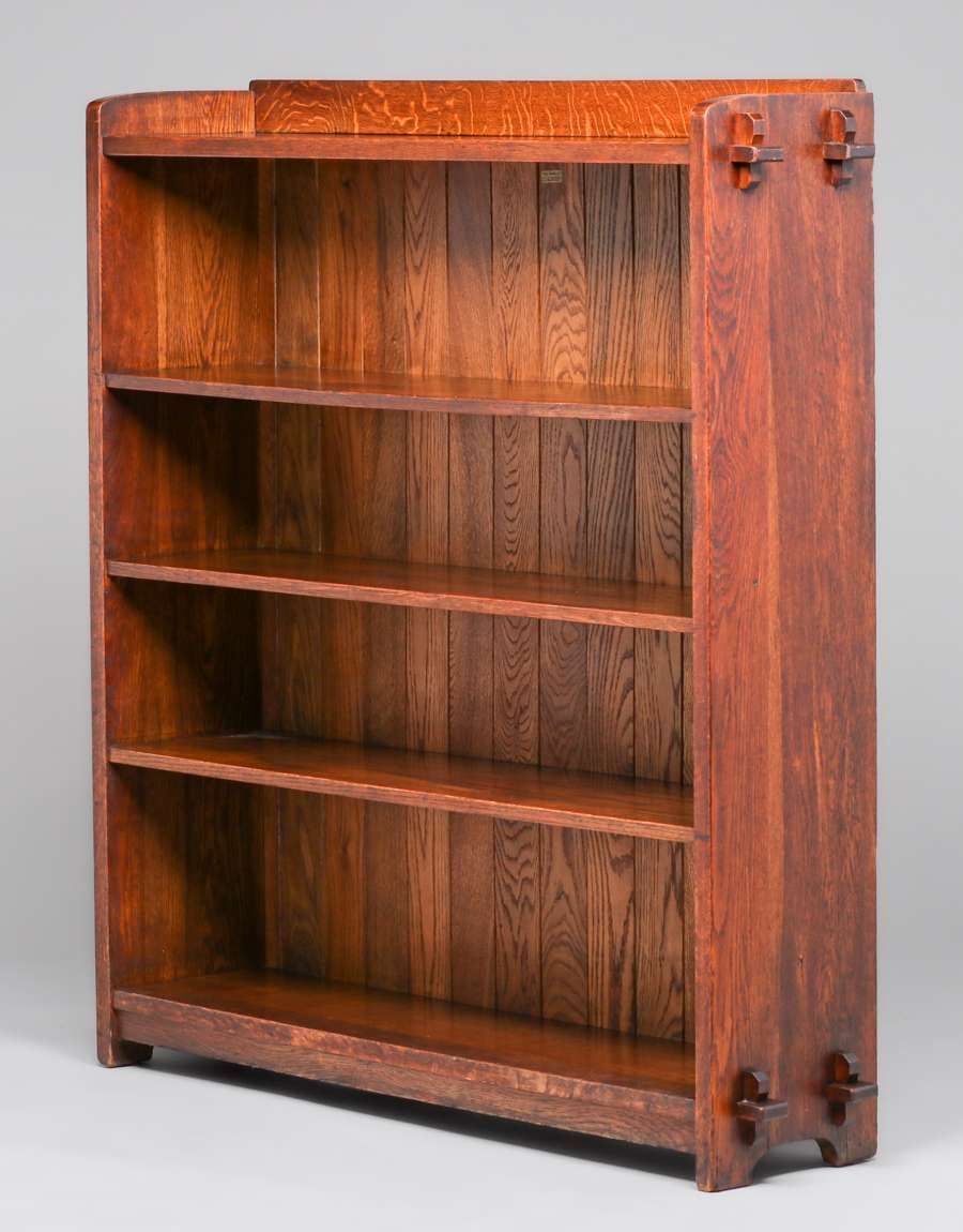 L&JG Stickley Open Bookcase c1908-1912. Chamfered board back and tenon & key construction. Signed. Excellent original finish. 55.25"h x 49"w (52.5" with tenons) x 12"d SOLD