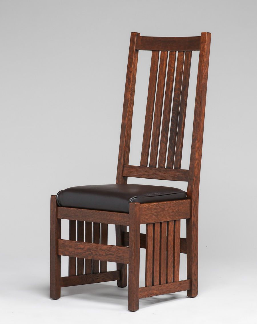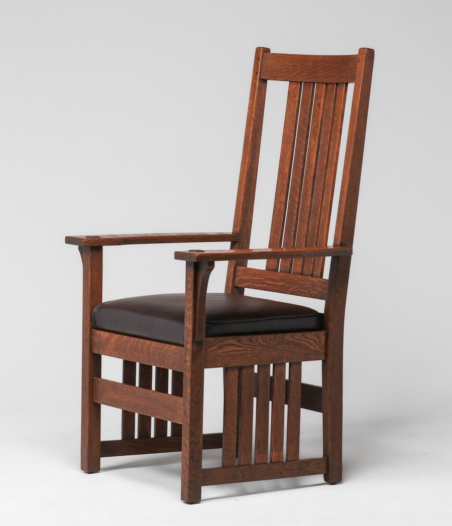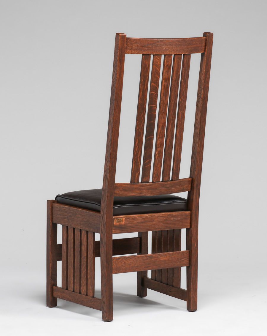 L&JG Stickley Set of 6 Slatted Tallback Chairs c1905-1907. Signed. Very nicely refinished. Rock solid sturdy. Arm chair 45.5"h x 27.5"w x 21"d. Side chairs 45″h x 19.25″w x 17.25″d SOLD