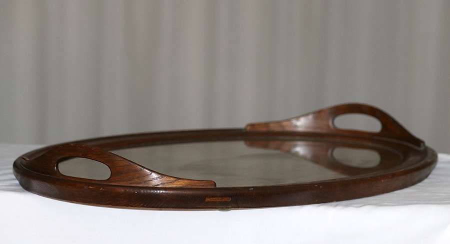 L&JG Stickley two-handled oval oak serving tray with inset glass c1910. Unsigned. Excellent original finish. Splined with classic L&JG Stickley splines. 23"w x 15" SOLD
