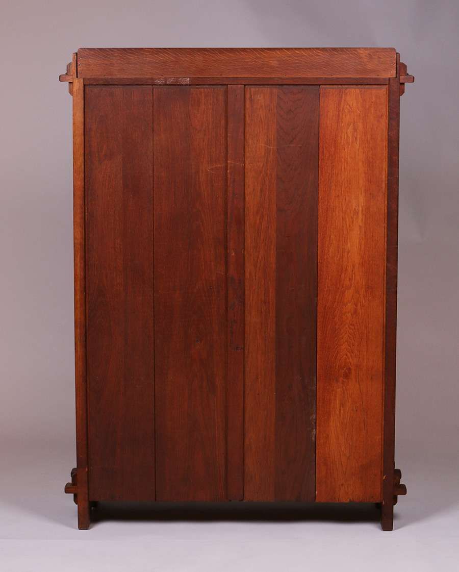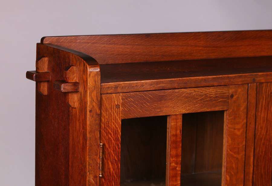 Matched Pair of L&JG Stickley Two-Door Bookcases with Tenon & Key Construction. Excellent original finish. Unsigned. 55"h x 36"w (+3" with Tenons) x 12"d SOLD