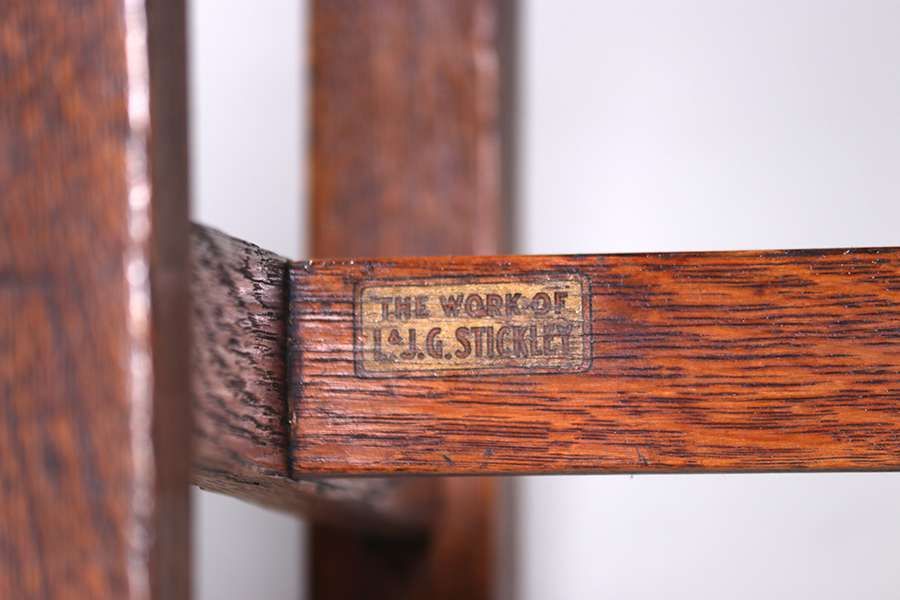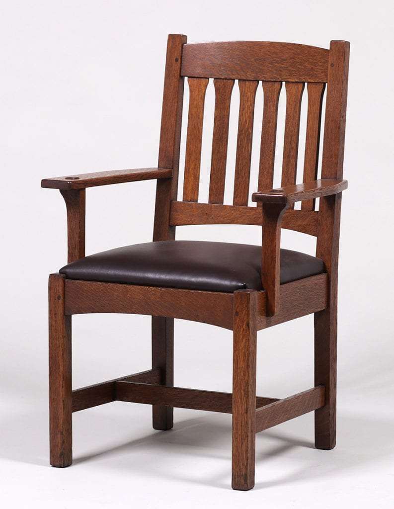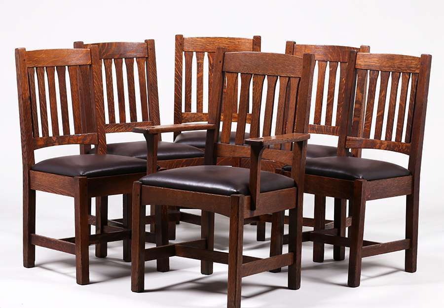 Set of 6 L&JG Stickley #323 “Arrowback” dining chairs. Signed. Excellent original finish. Very sturdy. This is considered by many of us to be the best model of dining chair by L&JG Stickley. Side chairs #323 measure 38″h x 18.5″w x 18″d. Armchair #324 measures 29″h x 26″w x 23″d SOLD