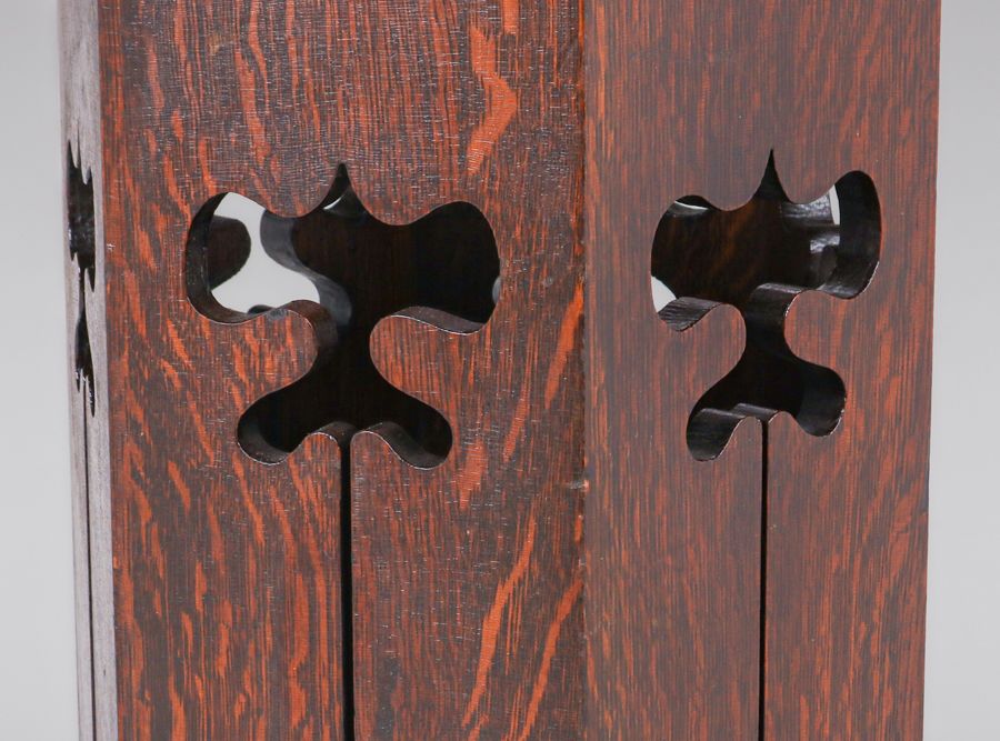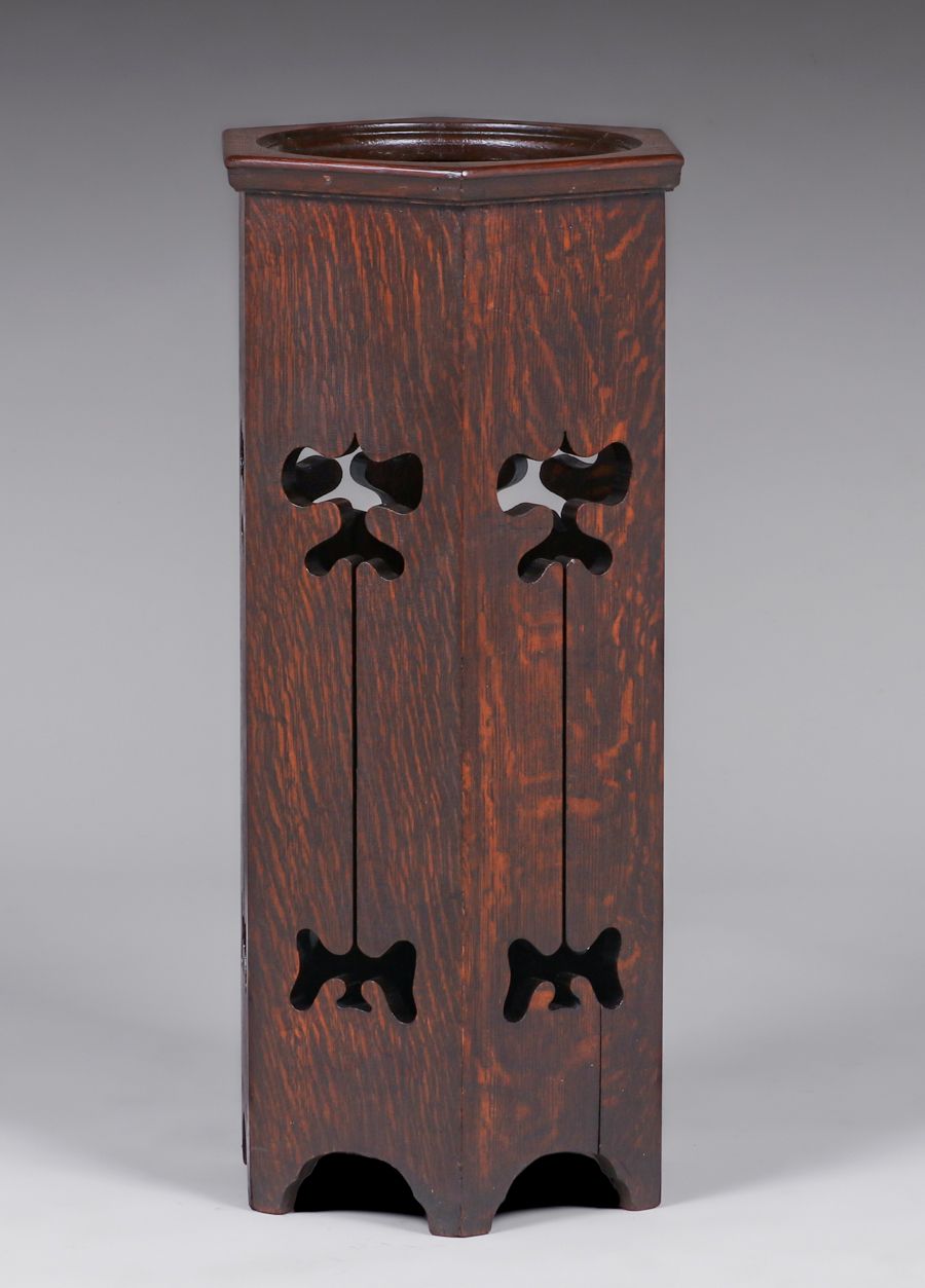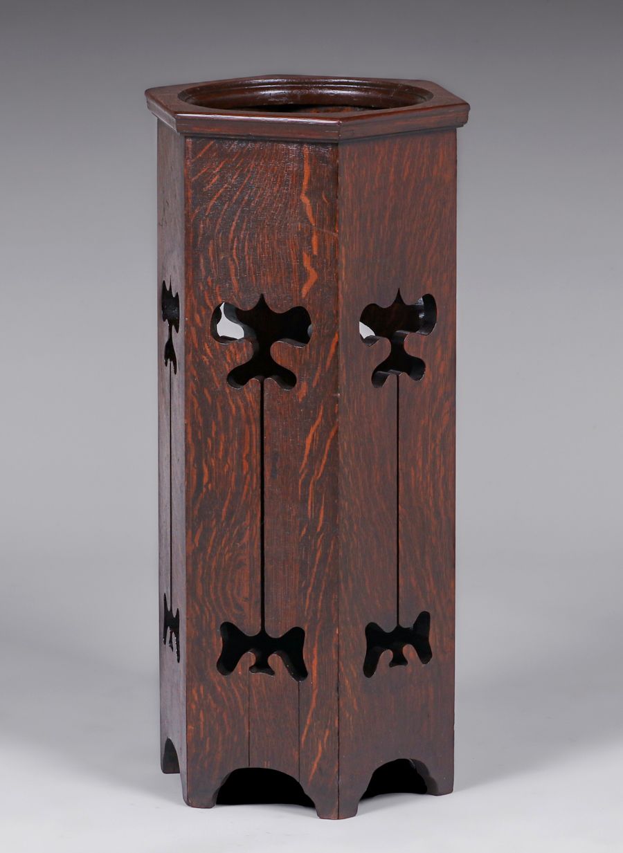 David Kendall - Phoenix Furniture Co Cutout Hexagonal Umbrella Stand c1898. Unsigned. Top surfaced refinished perfectly to match excellent original finish. 28.5"h x 12" x 12" SOLD