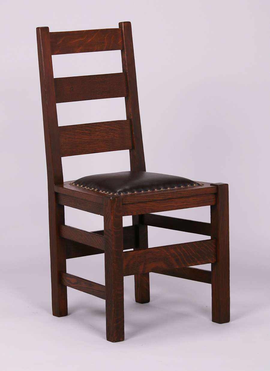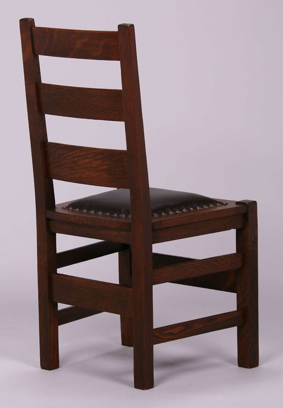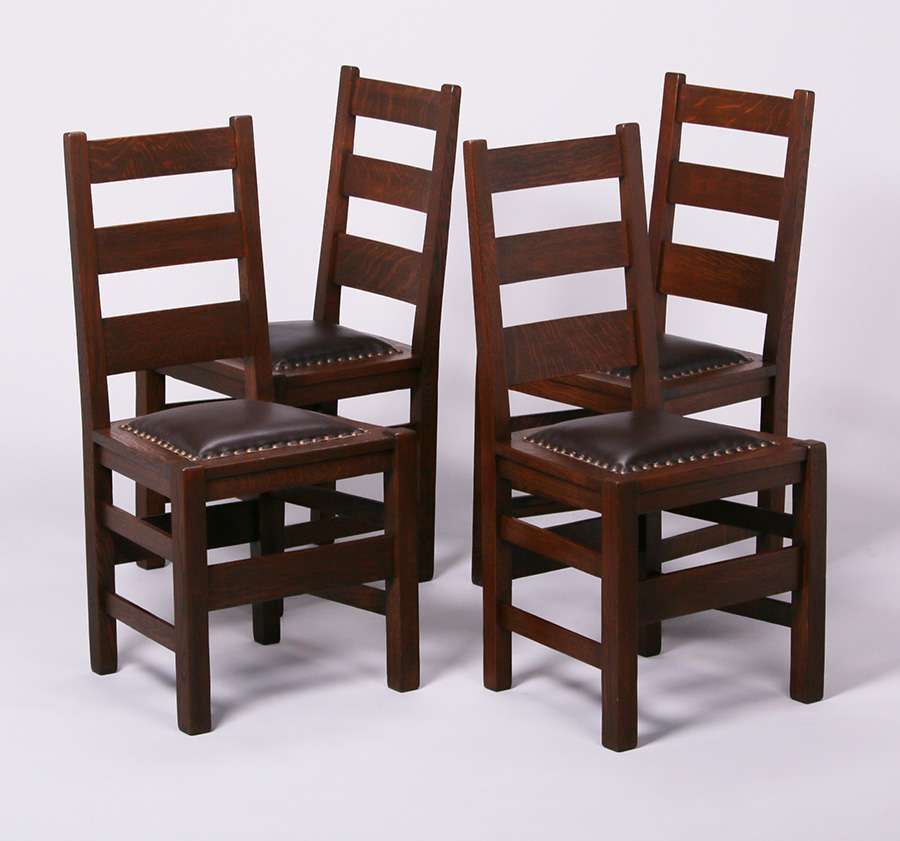 Set of 4 Stickley Brothers ladder back dining chairs. Unsigned. Very nicely refinished. Rock-solid sturdy. 37"h x 18.25"w x 16.25"d $3500 Set of 4