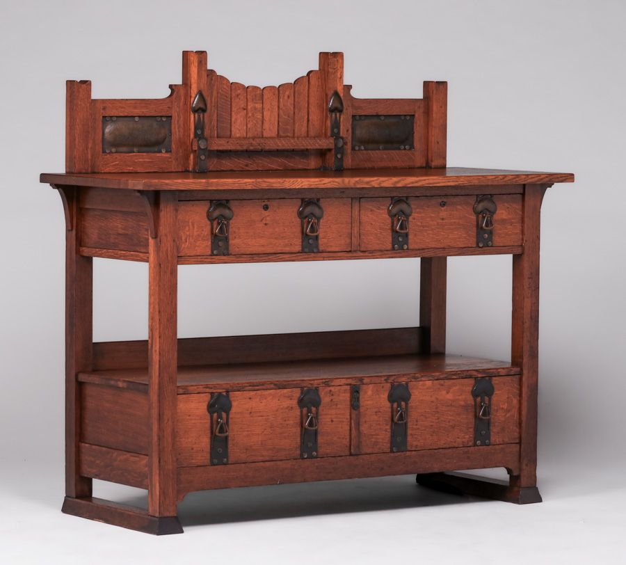 Early Stickley Brothers Four-Drawer Server c1902. Incredible example of Stickley Brothers hammered copper hardware. Unsigned. Excellent original finish. 54"w x 49"h x 21.25"d SOLD