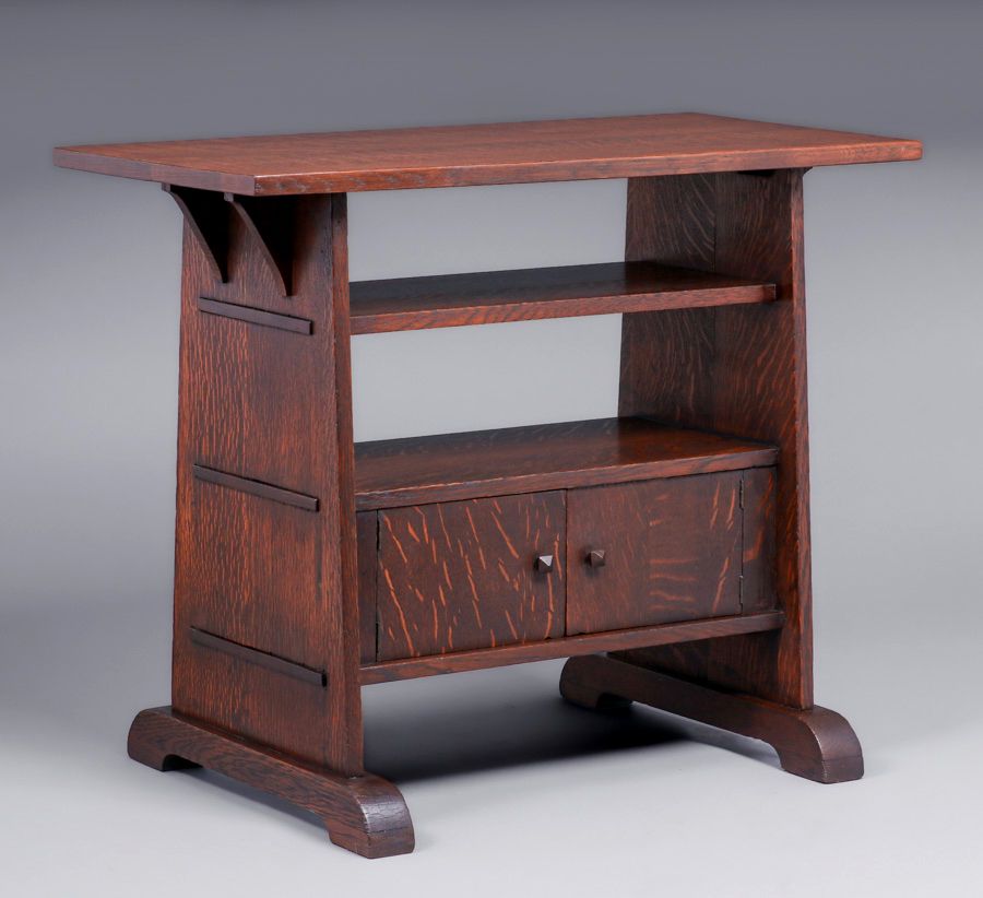 Rare Stickley Brothers Trestle Table Cabinet c1905. Unsigned. Very nicely refinished. The two lower doors were probably a custom order for this very functional table. 36"w x 29.75"h x 17.75"d (22"d at base) SOLD