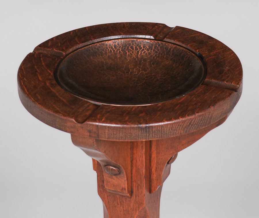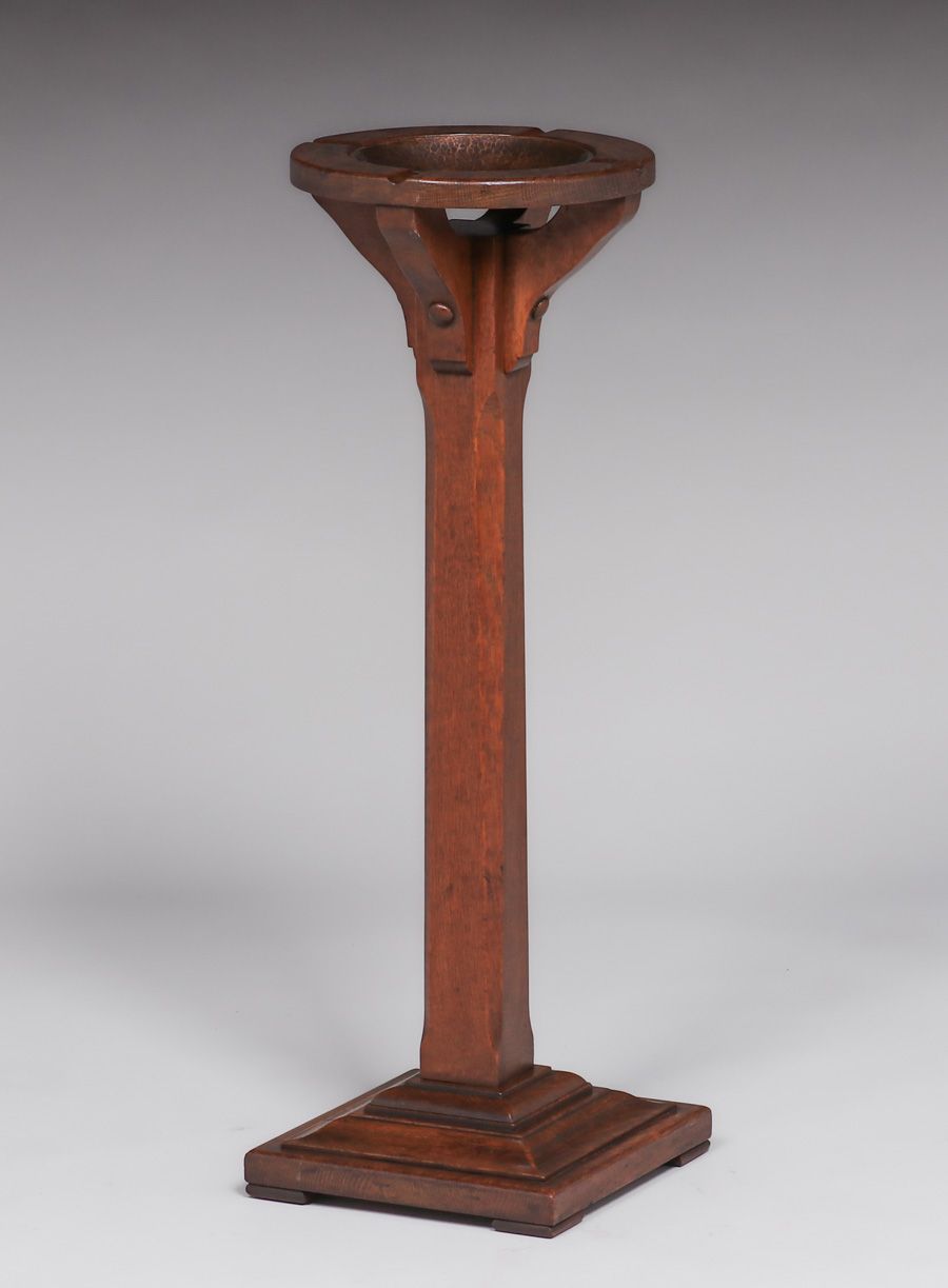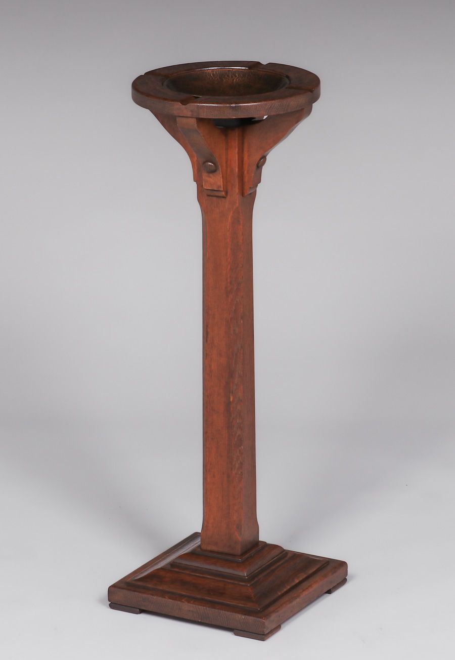 Stickley Brothers #142 Prairie School Oak Standing Cigar Ashtray c1910. New patina to hammered copper ashtray. Signed. Excellent original finish. 30"h x 10.25"d SOLD