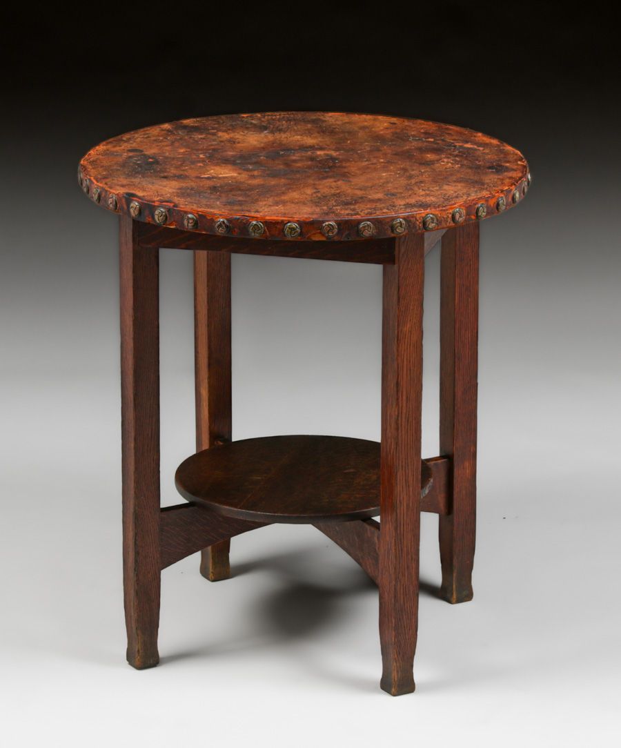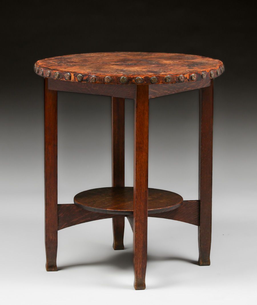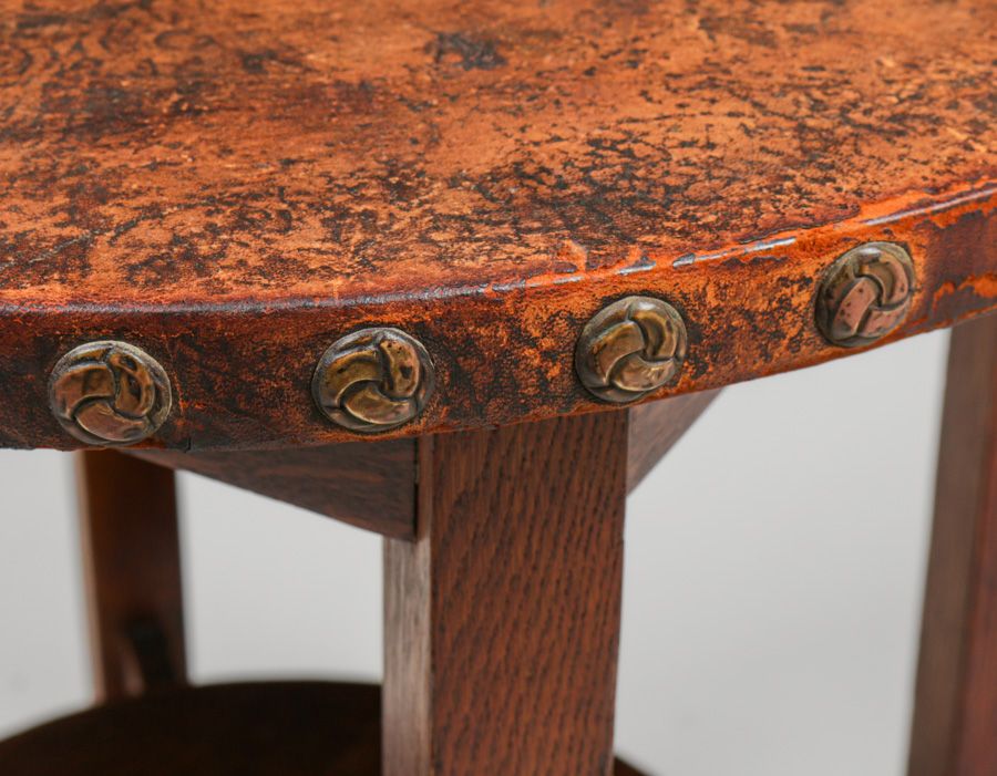 21779. Stickley Brothers Leather-Top Table c1905. Unsigned. Excellent original finish. Separations to beautiful original leather top. 26.5″d x 29.75″h $1800