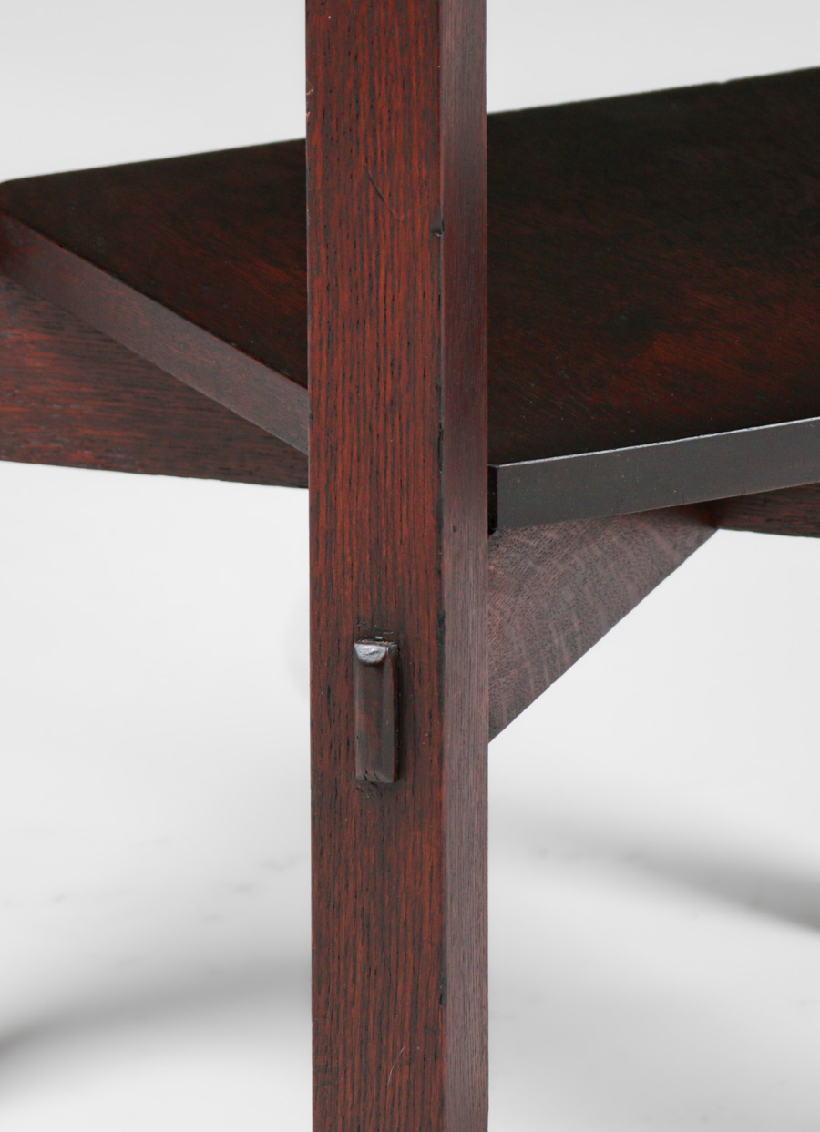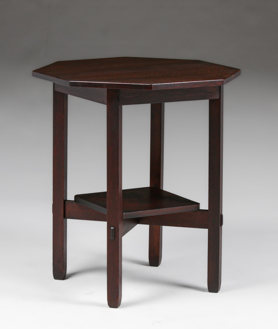 21738. Stickley Brothers Octagonal Oak Lamp Table c1910. Unsigned. Very nicely refinished. Very sturdy. 29.5″h x 26″x 26″ $1800