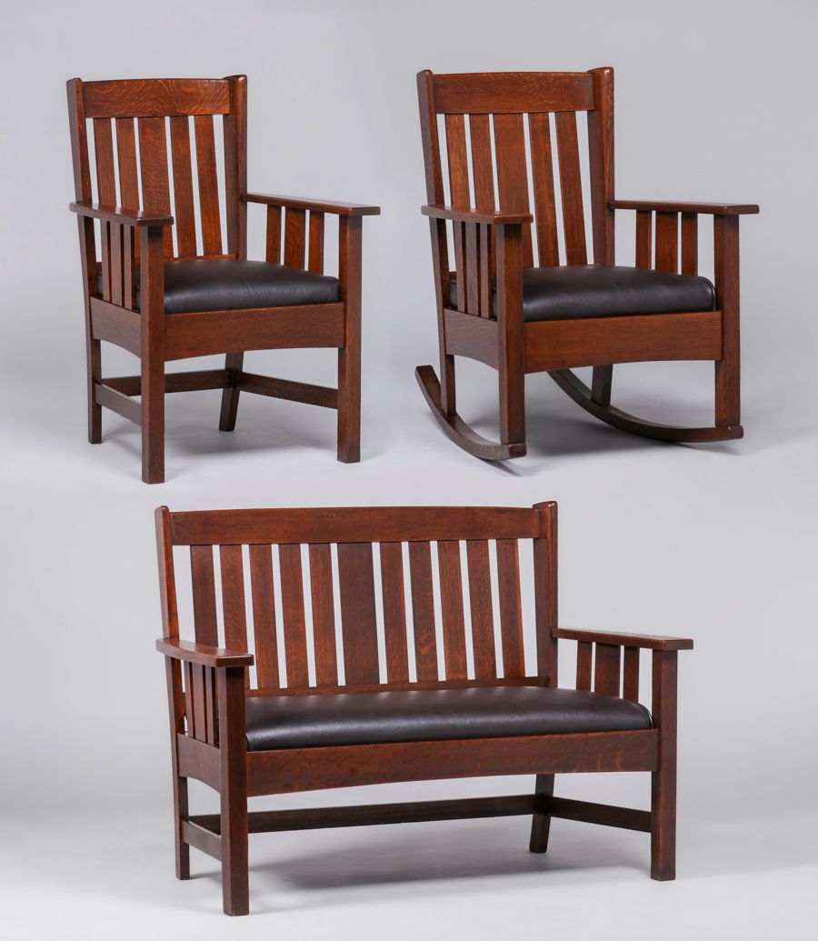 - Stickley Brothers Three-Piece Slatted Armchair, Rocker & Settle Set c1910