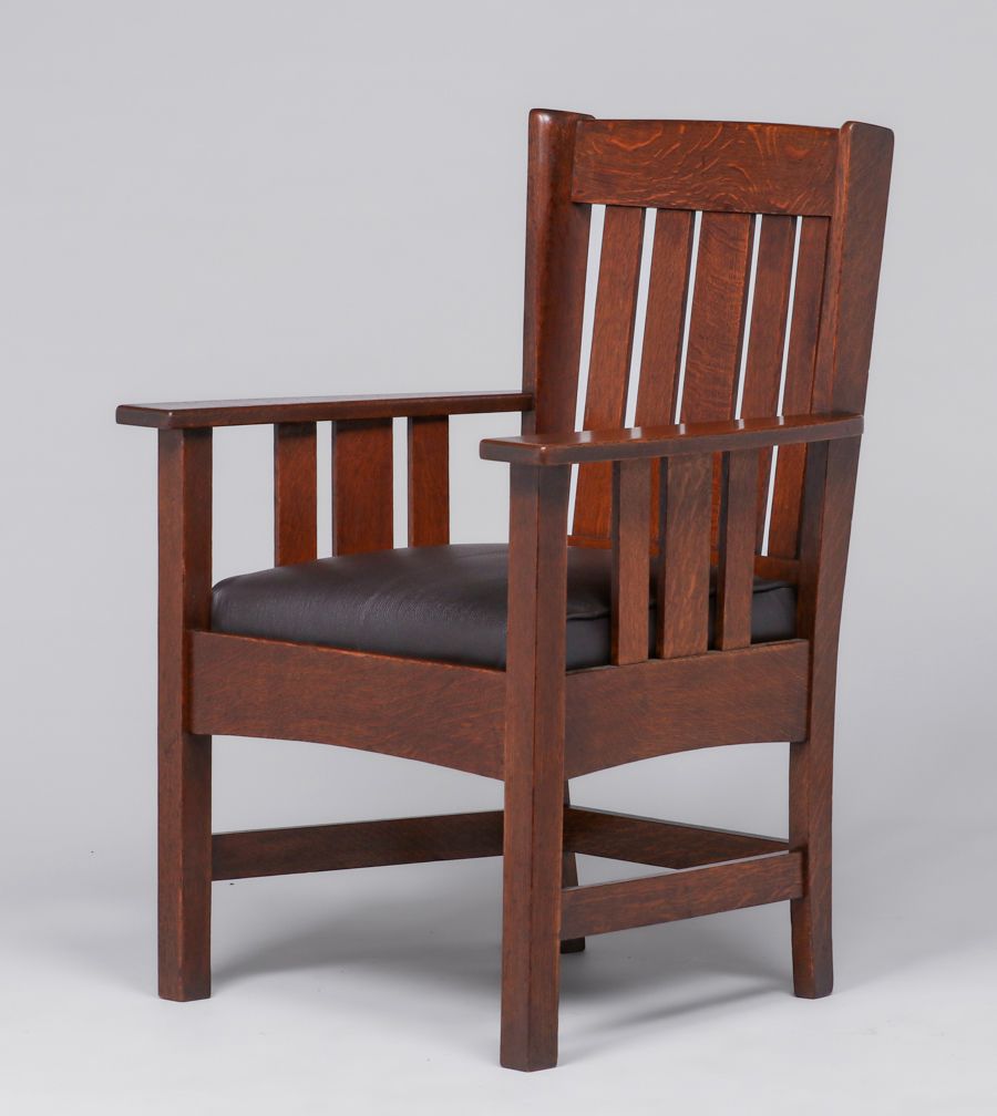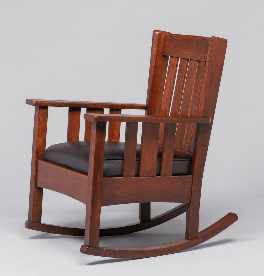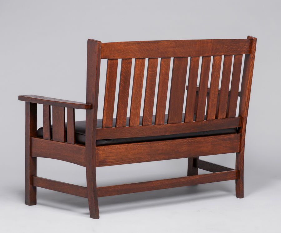 Stickley Brothers Three-Piece Slatted Armchair, Rocker & Settle Set c1910. Signed. Excellent original finish. Settle 54w x 39h x 25d. Armchair 37.5h x 26.5w x 24d. Rocker 34h x 26.5w x 29.5d SOLD