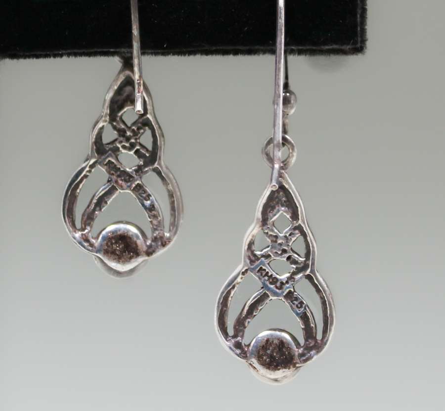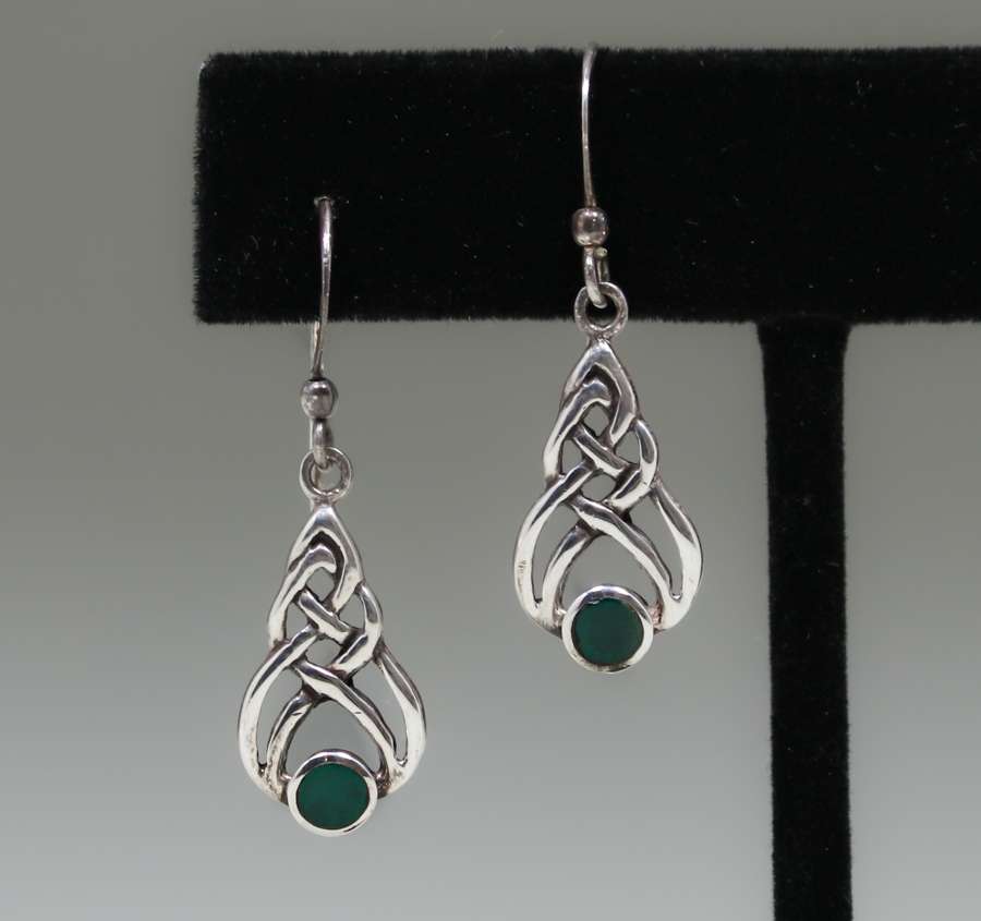 10086. Celtic Arts & Crafts Sterling Silver & Chrysoprase Earrings. Unsigned. 1.25″ long