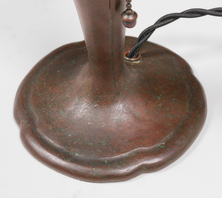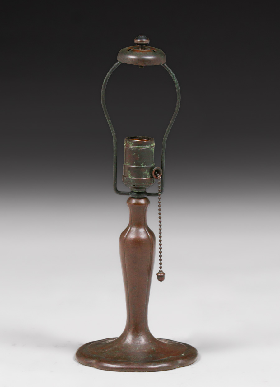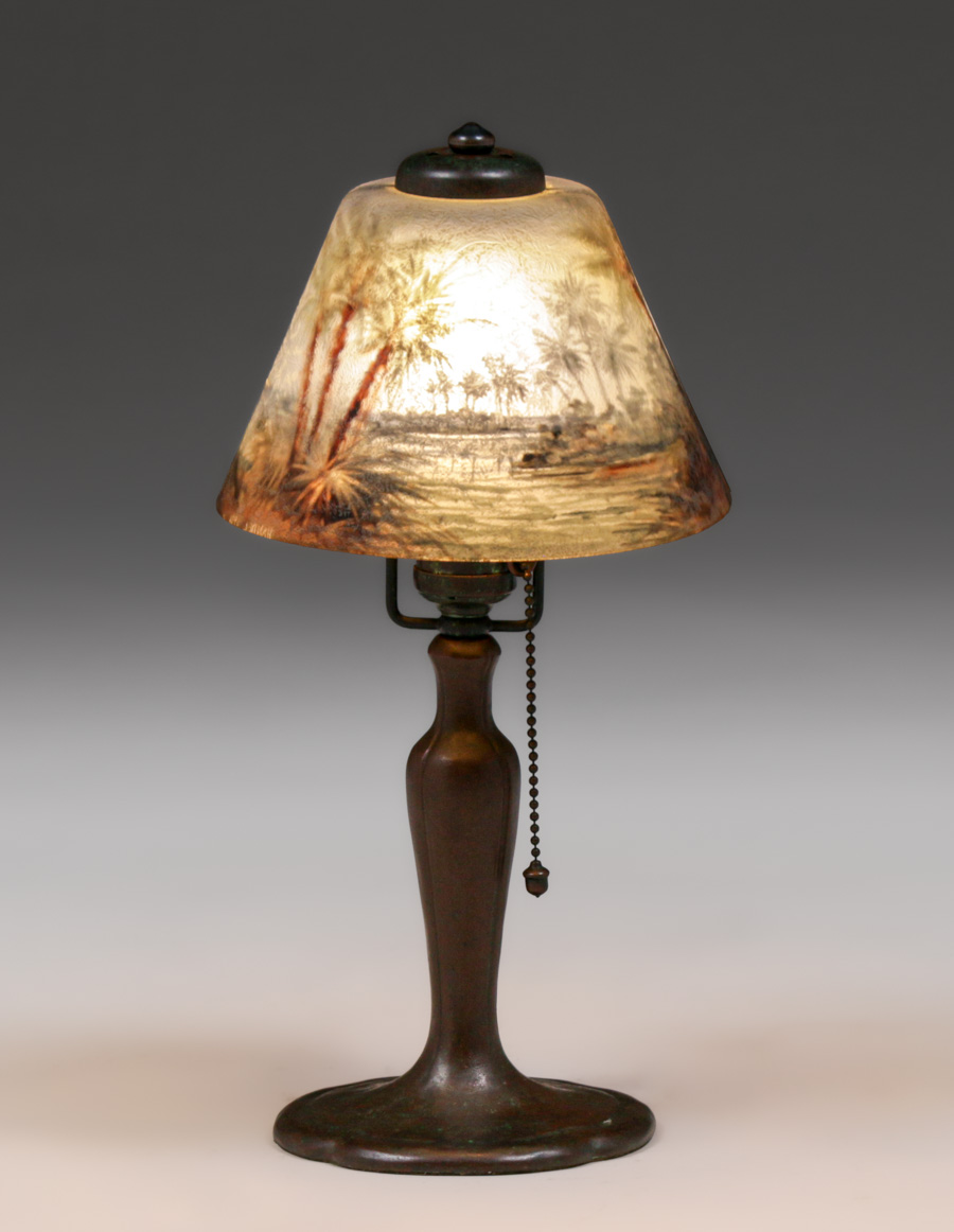 21712. Handel #6558 Reverse-Painted Boudoir Lamp c1910.  Signed.  Excellent original patina. Original reverse-painted glass in perfect condition.  13.75″h x 6.75″d $3200