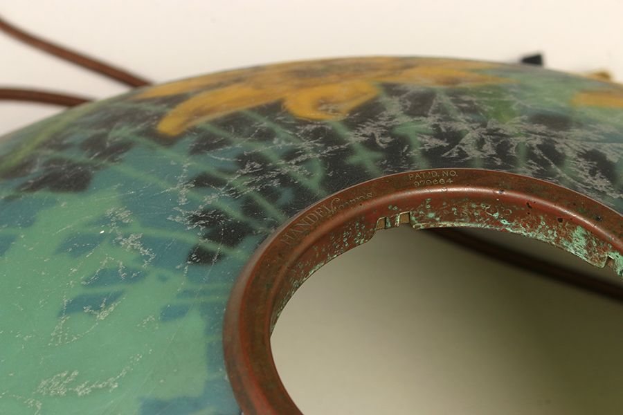 Handel #7122 Reverse-Painted Yellow Daffodil Lamp c1910. Signed. Excellent original patina. Original glass shade in perfect condition. 23.5”h x 17.75”d