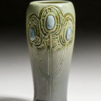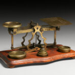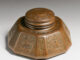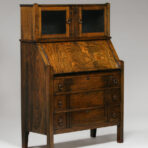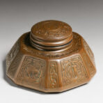 17953. Japonesque Arts & Crafts Hammered Copper & Amber Glass Hanging Light c1910. Unsigned. Excellent original patina. Original amber glass in perfect condition. 30″h overall. Lantern 16″h x 13.25″ x 13.25″. Ceiling plate 5.25″ x 5.25″ SOLD