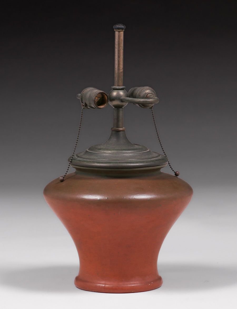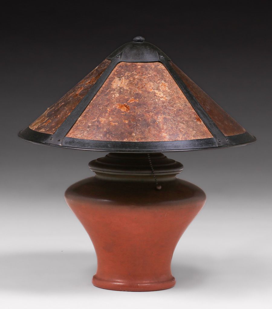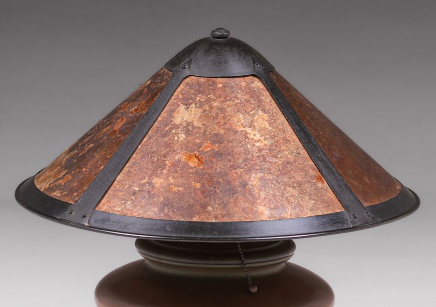 Lillian Palmer Copper & Stenciled Mica Lamp c1910s. Unsigned. Original pottery base probably Weller. Excellent original patina and original mica. Pottery base in perfect condition. 19"h x 18.5"d