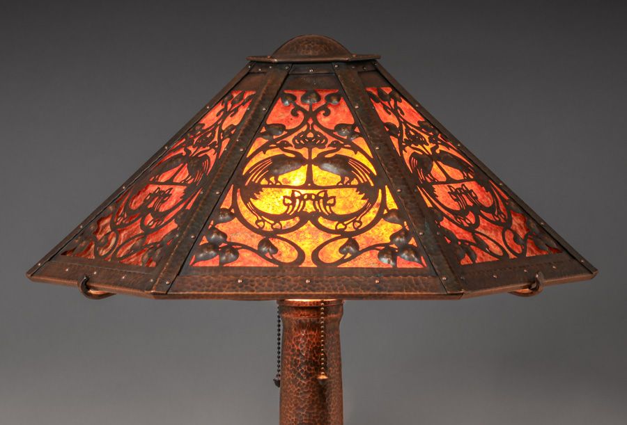 Contemporary Steve Helberg Hammered Copper & Mica Peacock Cutout Lamp c2010. Signed “S.F.H.”. Excellent condition. 25″h x 22″d $5500
