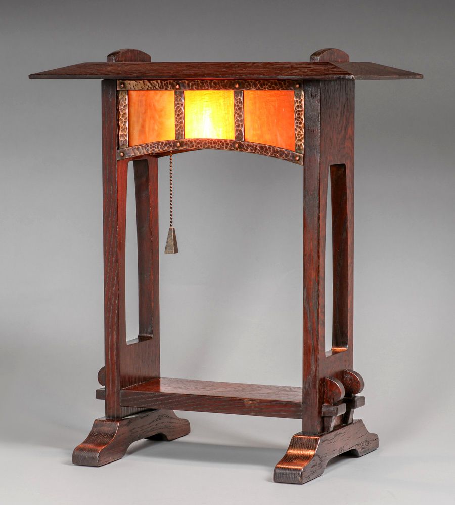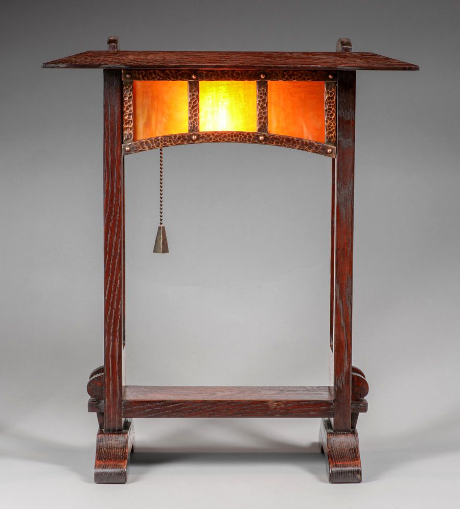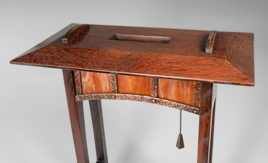 - Contemporary Steve Helberg Hammered Copper, Oak & Slag Glass Cutout Prairie Lamp 2002