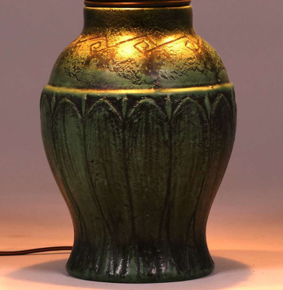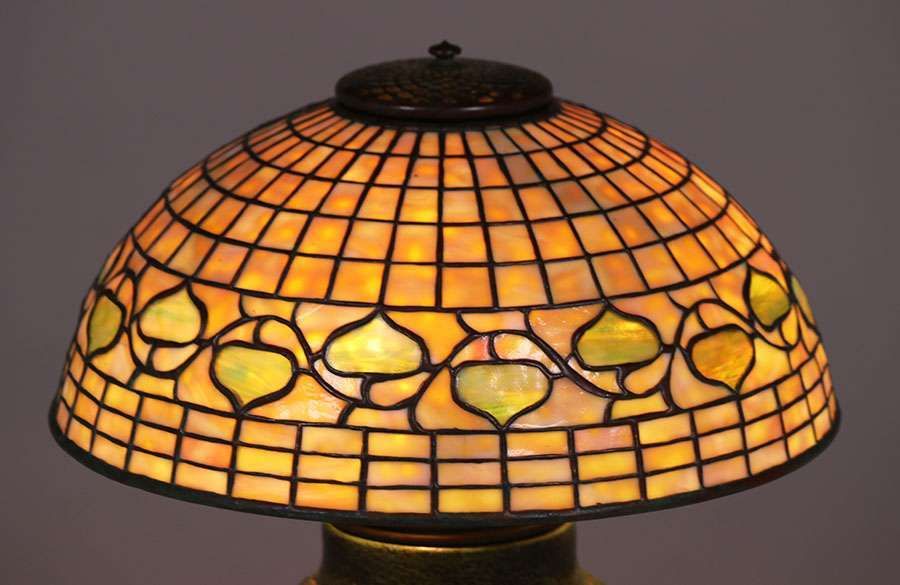 - Tiffany Studios Leaded Glass Acorn Lamp Wheatley Pottery Matte Green Base c1910