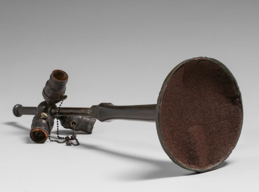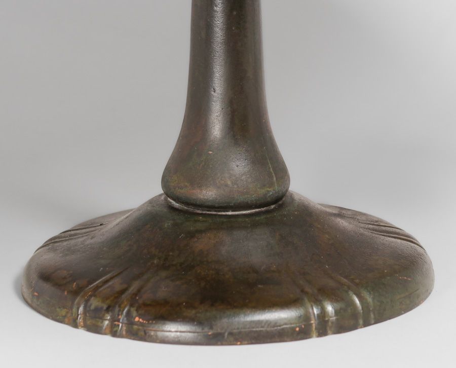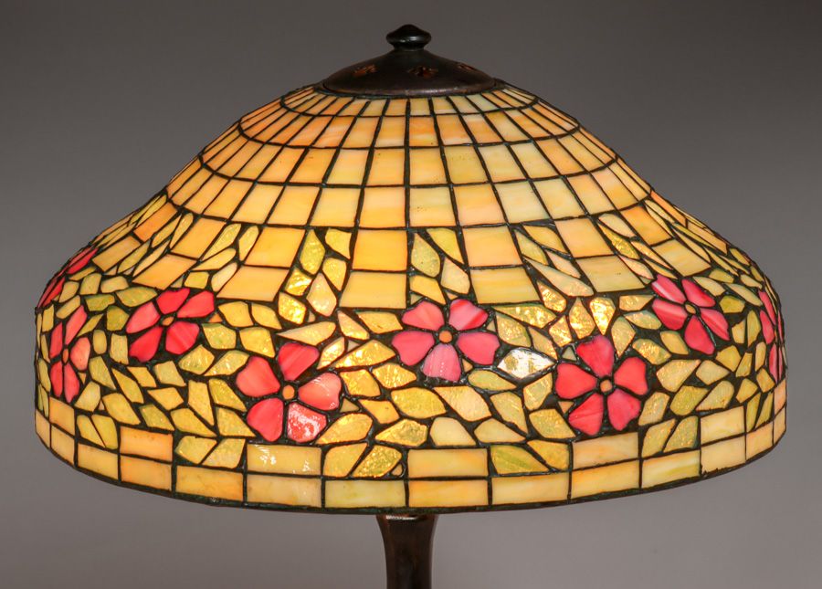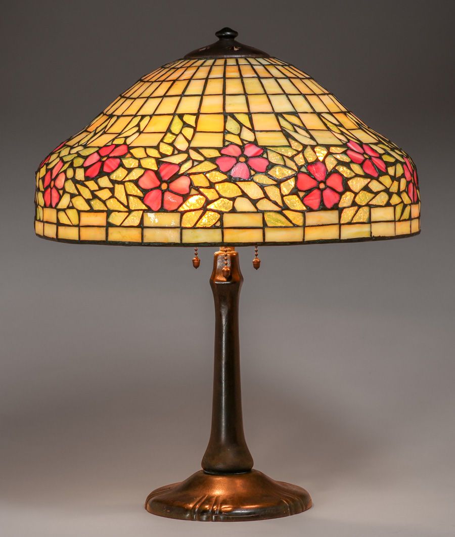 Unique Art Glass and Metal Company , Brooklyn, NY – Periwinkle floral design leaded glass lamp. When Louis Comfort Tiffany’s patent on the copper foil / leaded glass technique expired in 1903, Unique Art Glass and Metal Company was one of several companies that adopted Tiffany’s techniques and competed directly with Tiffany Studios. Unsigned. Excellent condition. Original patina to base. 22"h x 18"w SOLD