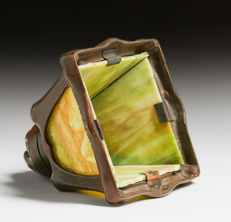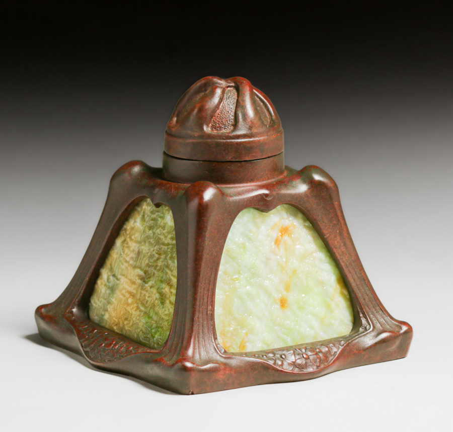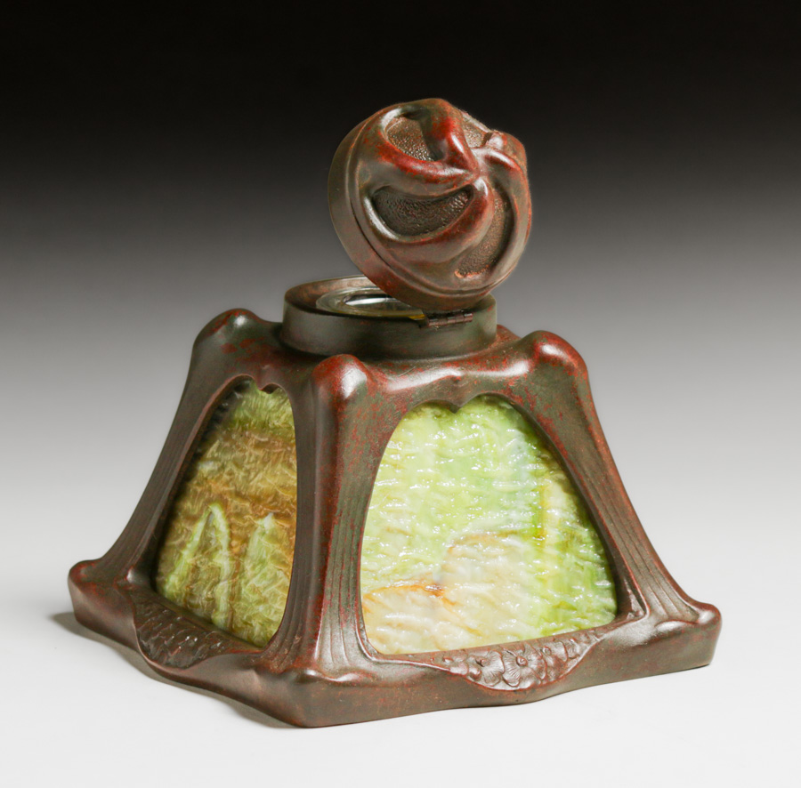 21726. Art Nouveau Bronze & Slag Glass Inkwell c1900s.  Unsigned.  Color added to original patina.  Original slag glass in perfect condition.  5″h x 4.75″ x 4.75″ $550