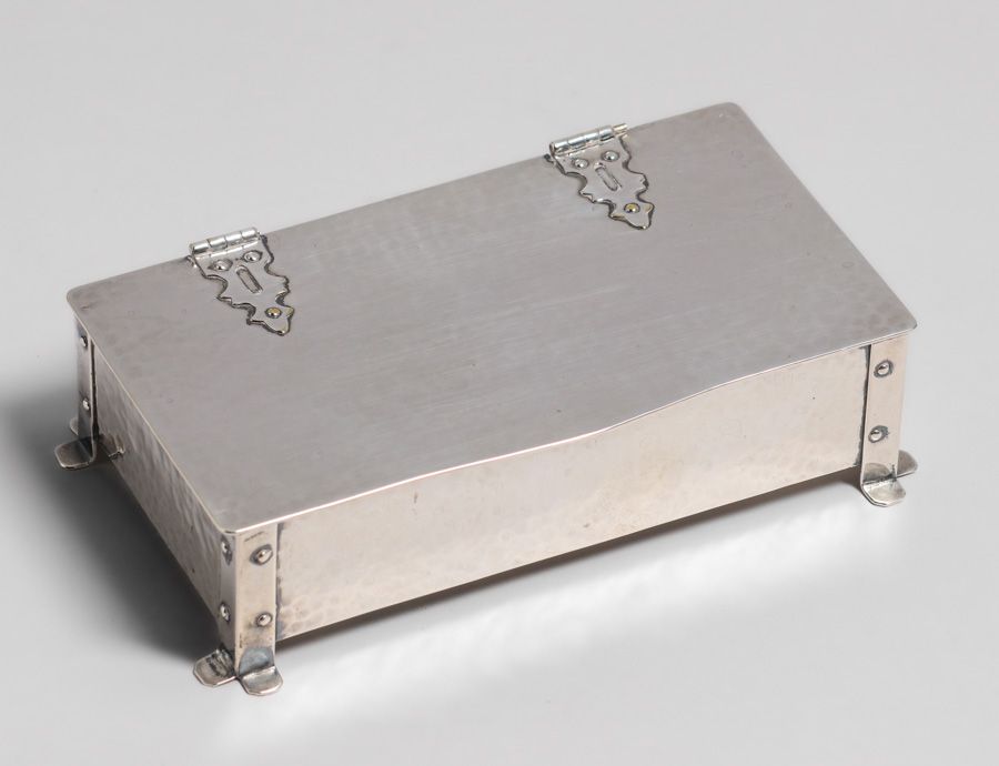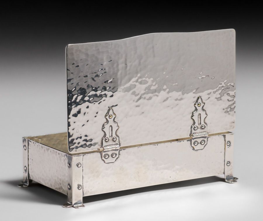 August Tiesselinck Hammered Copper Silver-Plated Strap-Hinge Box 1921. Tiesselinck was Dirk van Erp’s nephew. He came to America in 1911 to join his uncle Dirk. He only worked for himself for a brief 9 months in 1921 before going back to work for his uncle. Signed with “AT” mark and dated 9/21 for September 1921. Exhibited Bay Area Copper 1900-1950, Dirk van Erp & His Influence page 81, Figure 209. 6.75″w x 4″d x 1.75″h $5500