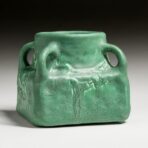 1585. Unusual wall mounted driftwood sculpture with Dirk van Erp hammered brass candlesticks c1960s. Unsigned. Original patina. 50″w. Accompanied by a Dirk van Erp hammered brass wall-pocket vase. Signed. Original patina. 10.75″w 6.5″h. Both pieces SOLD