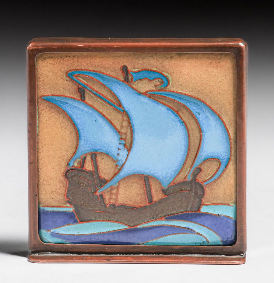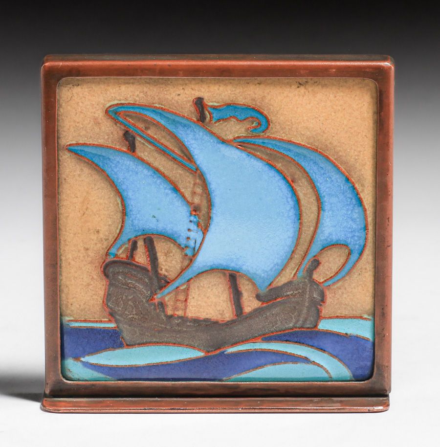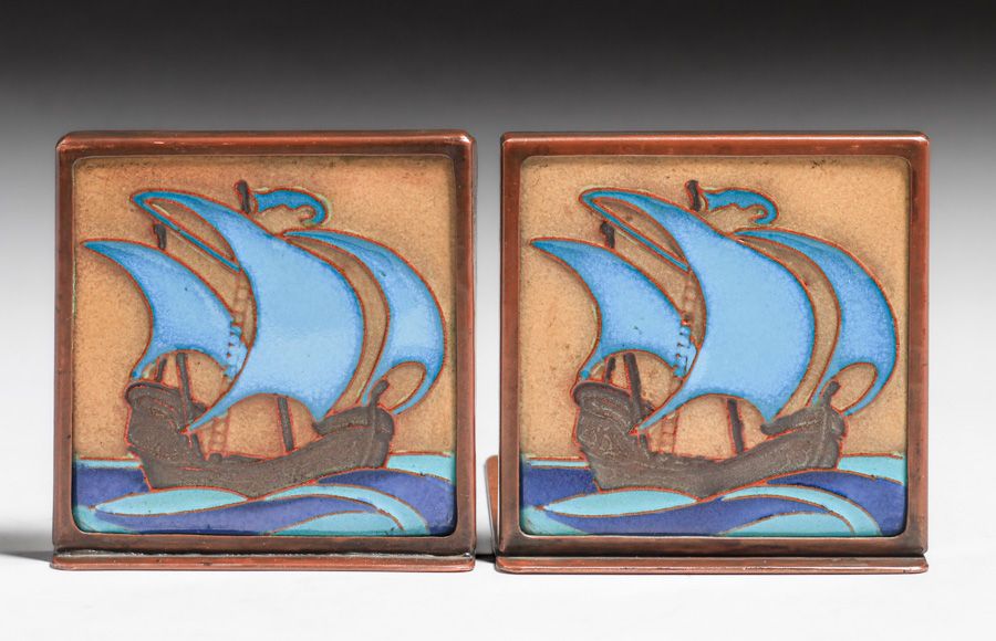- Dirk van Erp - California Faience Hammered Copper Galleon Ship Tile Bookends c1915-1920