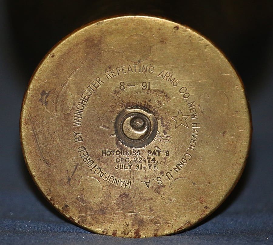 Dirk van Erp hammered brass artillery shell casing c1908-1909. Signed with Winchester Repeating Arms Co mark. Excellent original patina. 8"h x 3"d SOLD