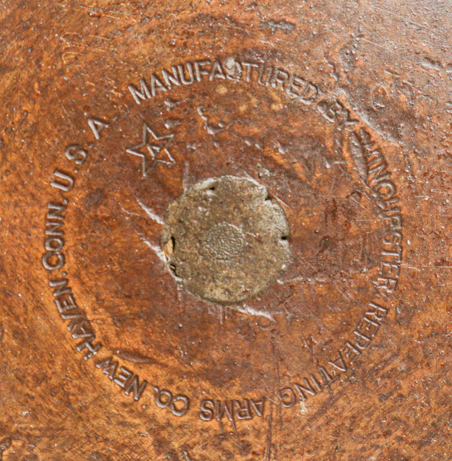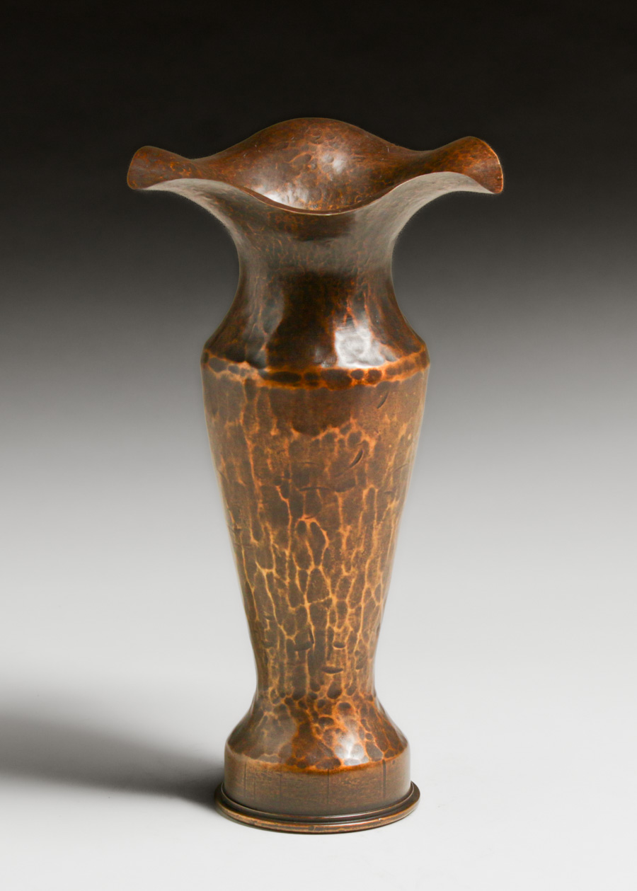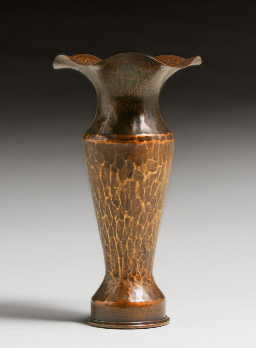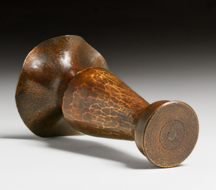 21722. Dirk van Erp Hammered Brass Artillery Shell Casing Vase c1902-1908. Signed with the Winchester Repeating Arms mark. Excellent new patina. 9.75″h x 5.25″d $1500