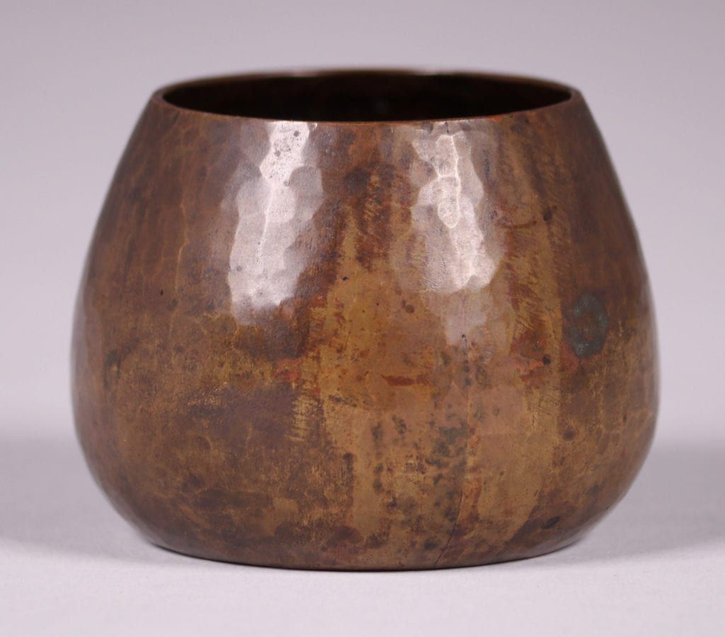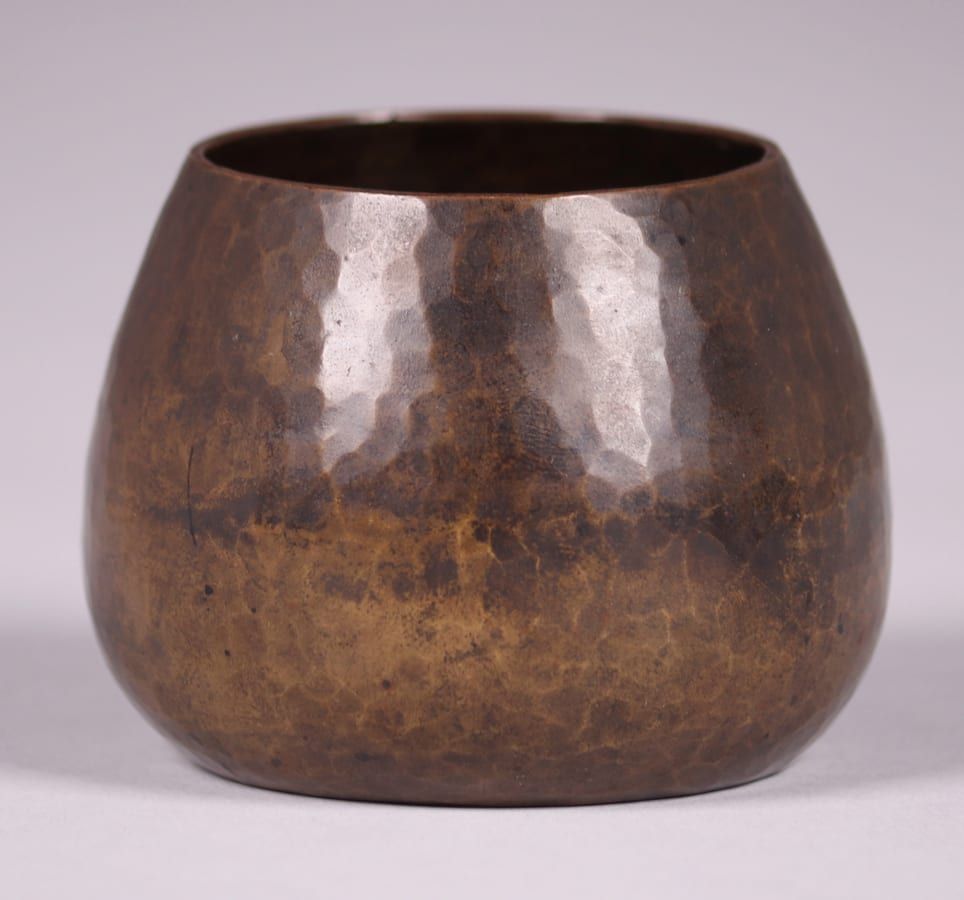 Dirk van Erp miniature cabinet hammered brass vase c1911-1912. Signed with early closed-box mark. Excellent original patina. 2.25"h x 2 5/8"d SOLD