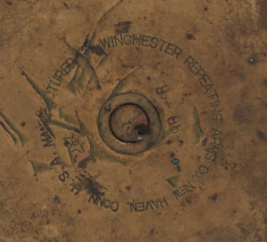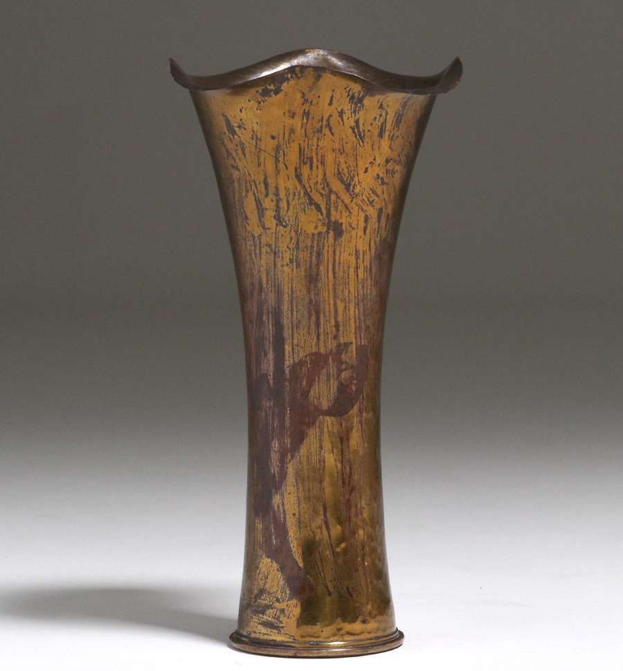 Dirk van Erp Hammered Brass Flared Shell Casing Vase c1902-1908. Marked Winchester 8-98. Exhibited in Bay Area Copper 1900-1950, Dirk van Erp & His Influence page 5, figure 2. Original patina. 10"h x 5.5"d SOLD