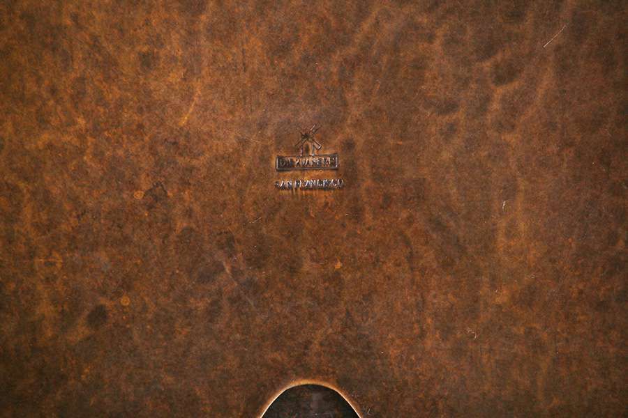 Dirk van Erp hammered brass picture frame (original a desk calendar frame). Signed with miniature Dirk van Erp windmill. Excellent new patina. 5"h x 6.5"w x 2"d SOLD