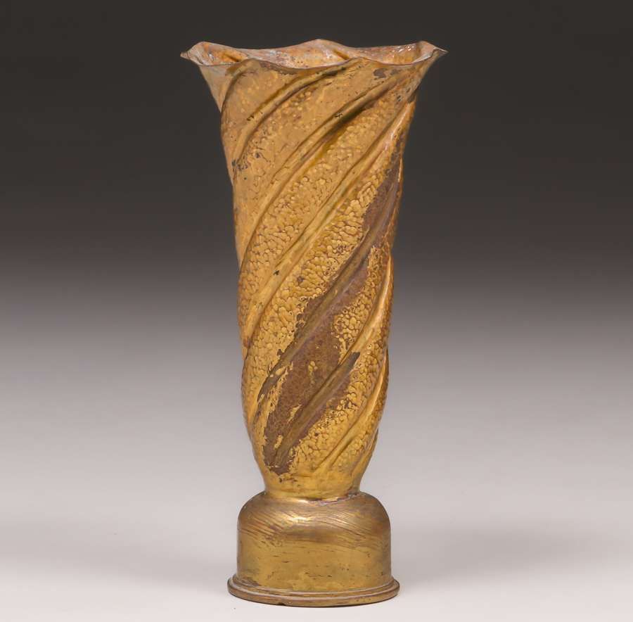 Dirk van Erp Hammered Brass Shell Casing Vase c1902-1908. Extraordinary spiral hammering. Original brass patina. Marked UMC Co 6-98. 9"h x 4.5"d SOLD