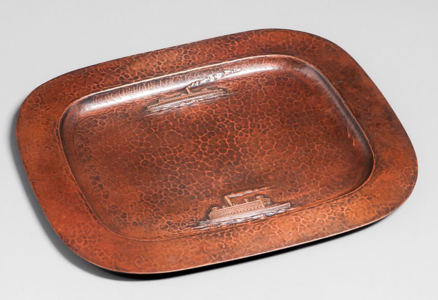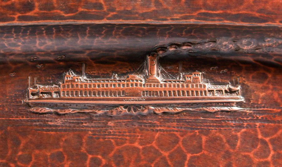 Dirk van Erp - August Tiesselinck Hammered Copper Commemorative San Francisco Bay Steamship Tray c1922-1926. Incredible detail of SS Alameda and SS Golden Gate. Tiesselinck returned to work for his Uncle Dirk in 1922 and continued there until taking a job as Metal Shop Teacher at San Francisco's Mission High School. Signed with open-box, San Francisco mark. Excellent new patina. 13" x 10" SOLD